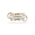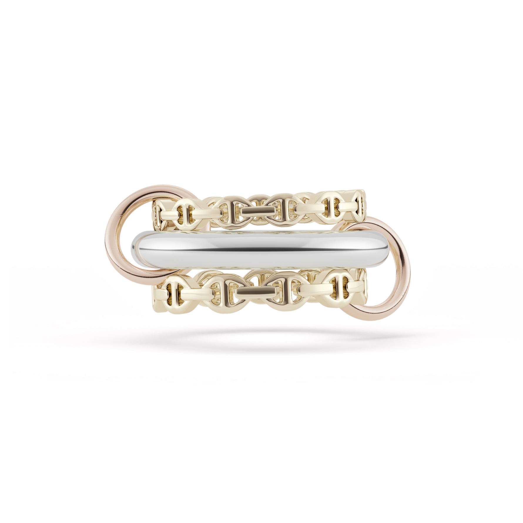 The Microdame SK Mix is comprised of three linked Hoorsenbuhs Microdame and Spinelli Kilcollin bands in 18k yellow gold & .925 sterling silver. All bands are linked together with 18k rose gold Spinelli Kilcollin connectors.