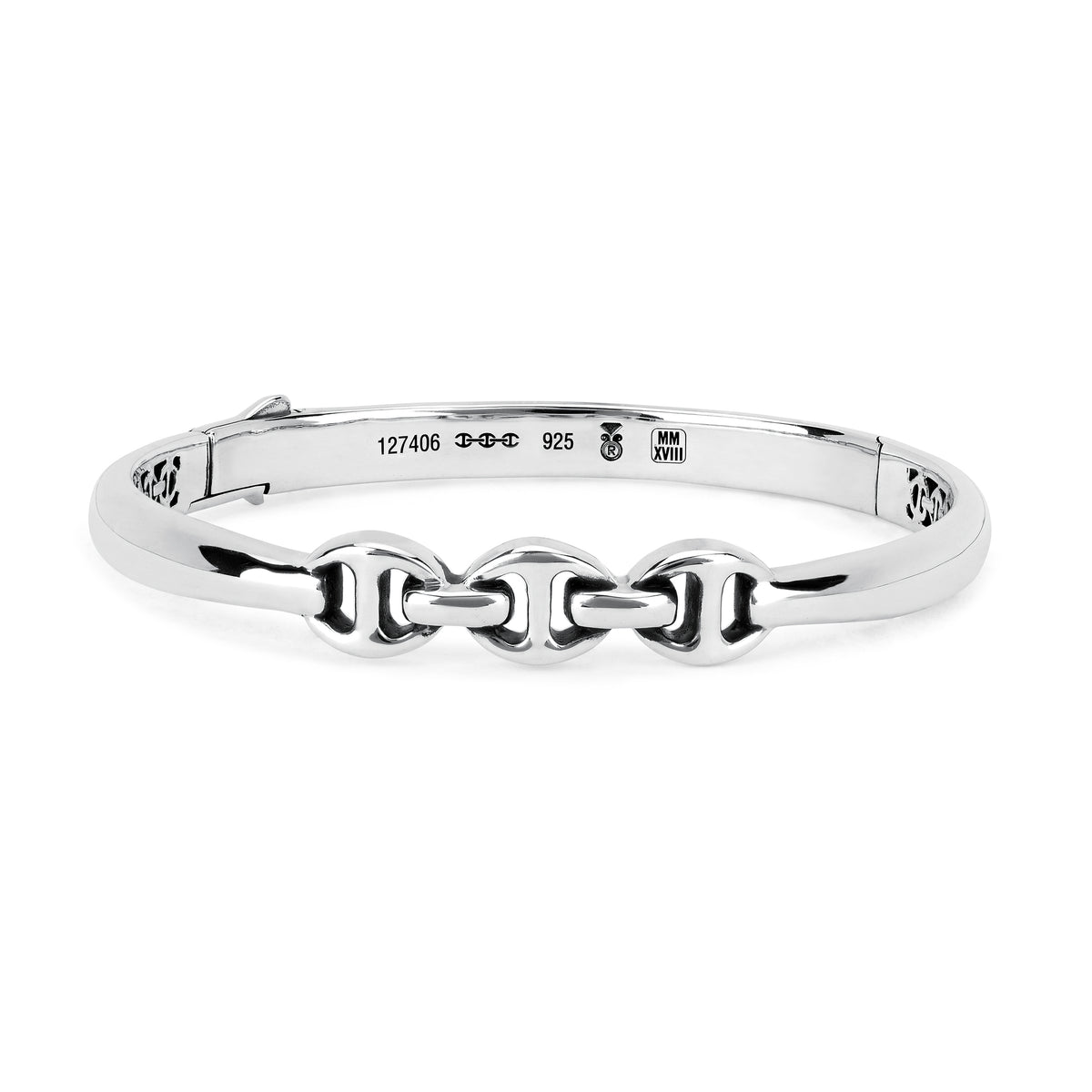 Unit price perA fused single band hinged cuff bracelet with our iconic tri-link detail in the center.