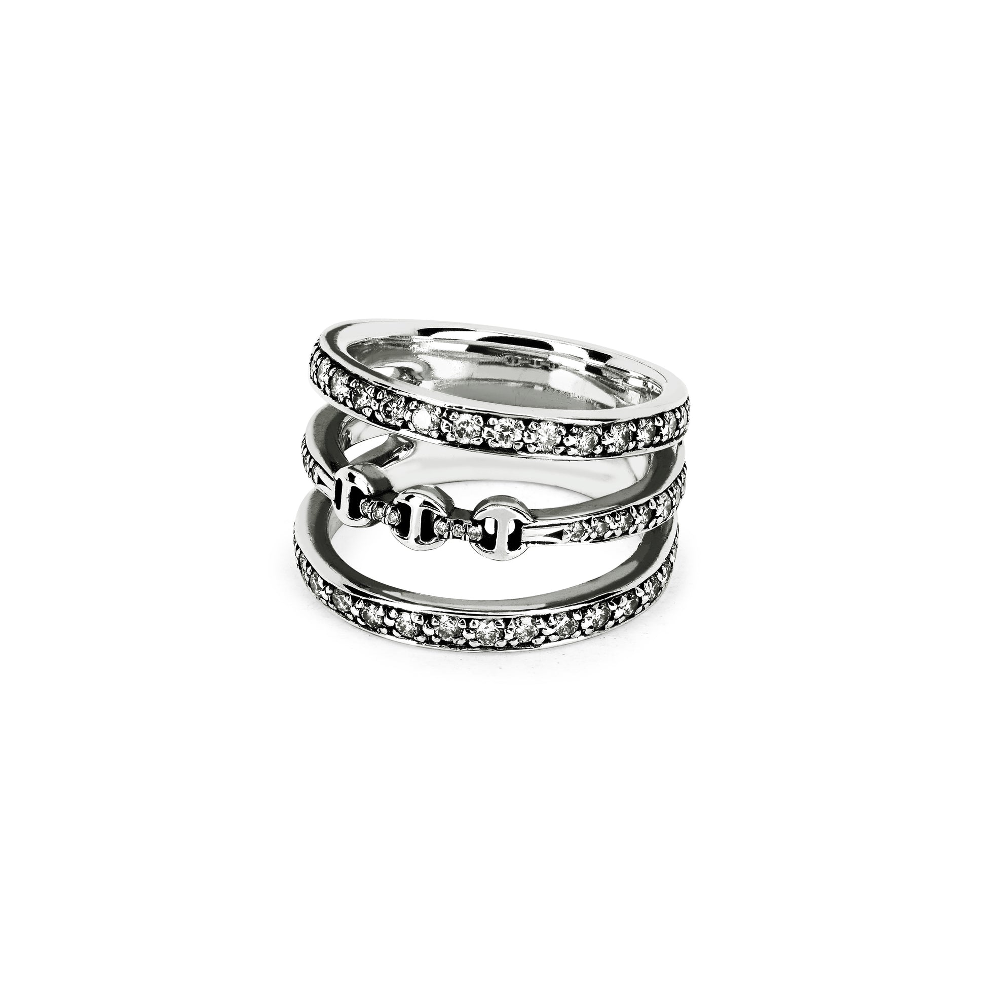 A fused triple band ring covered in diamonds with tri-link detail in the center.