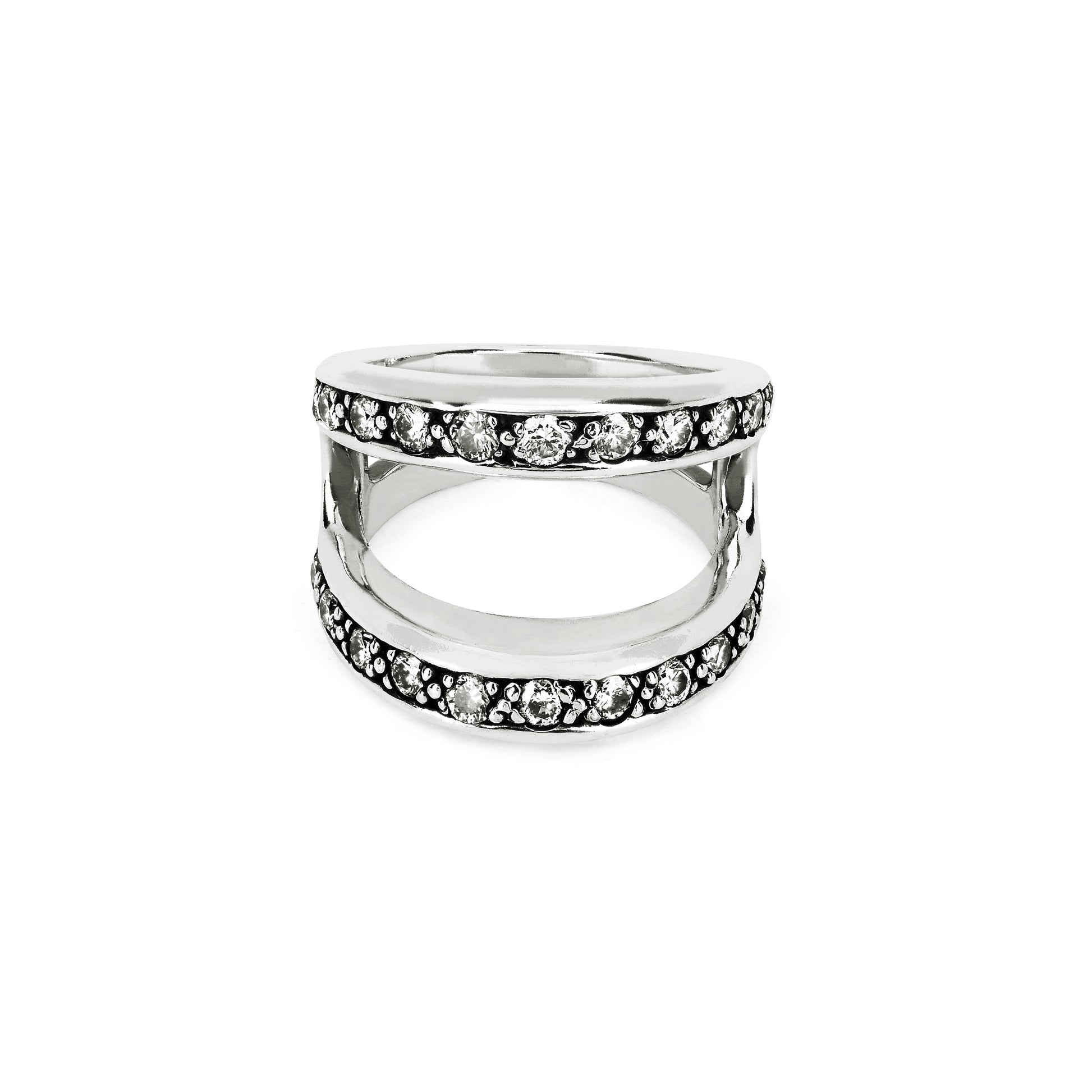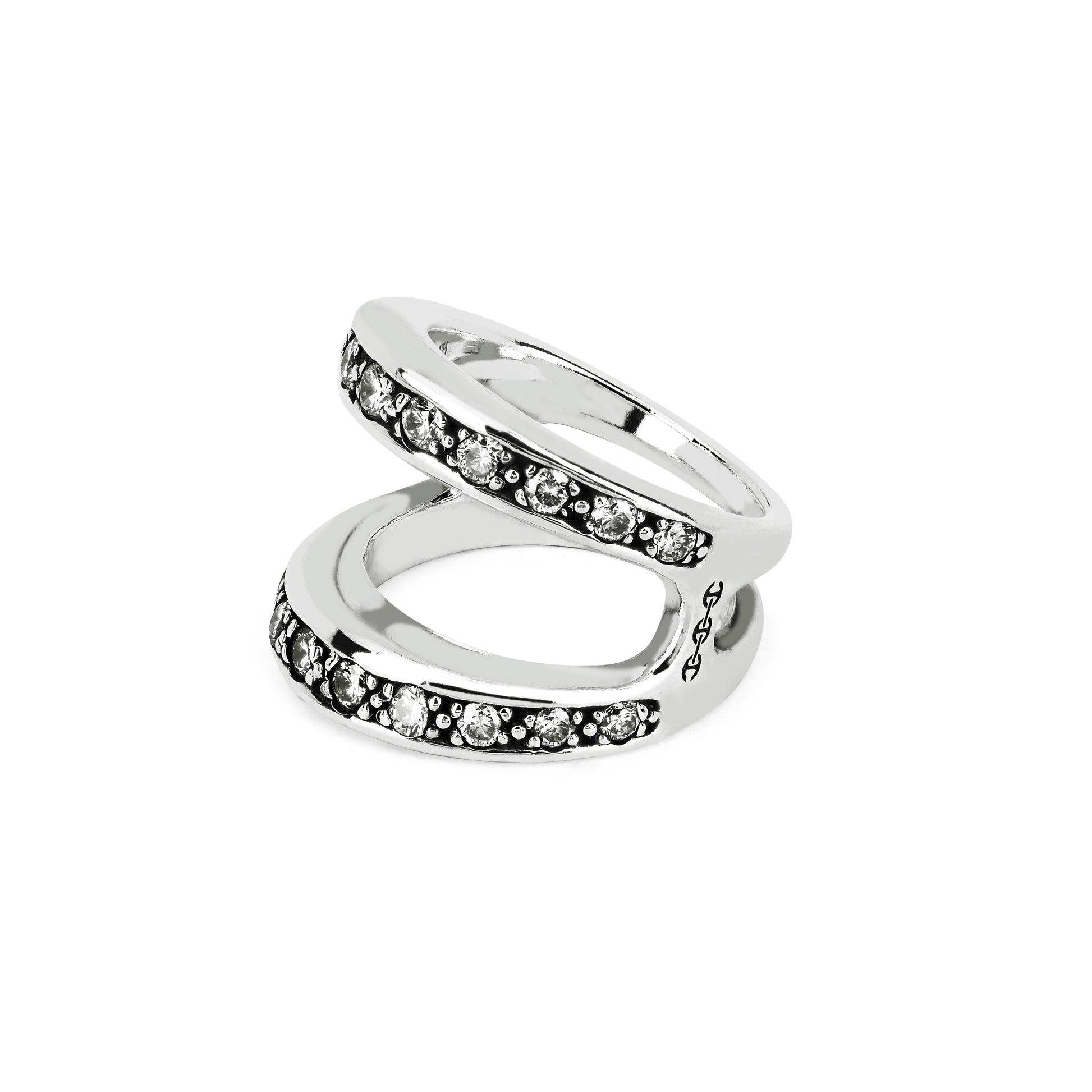 A single link turned on its side to create read as a graduated negative space between two diamond bands.