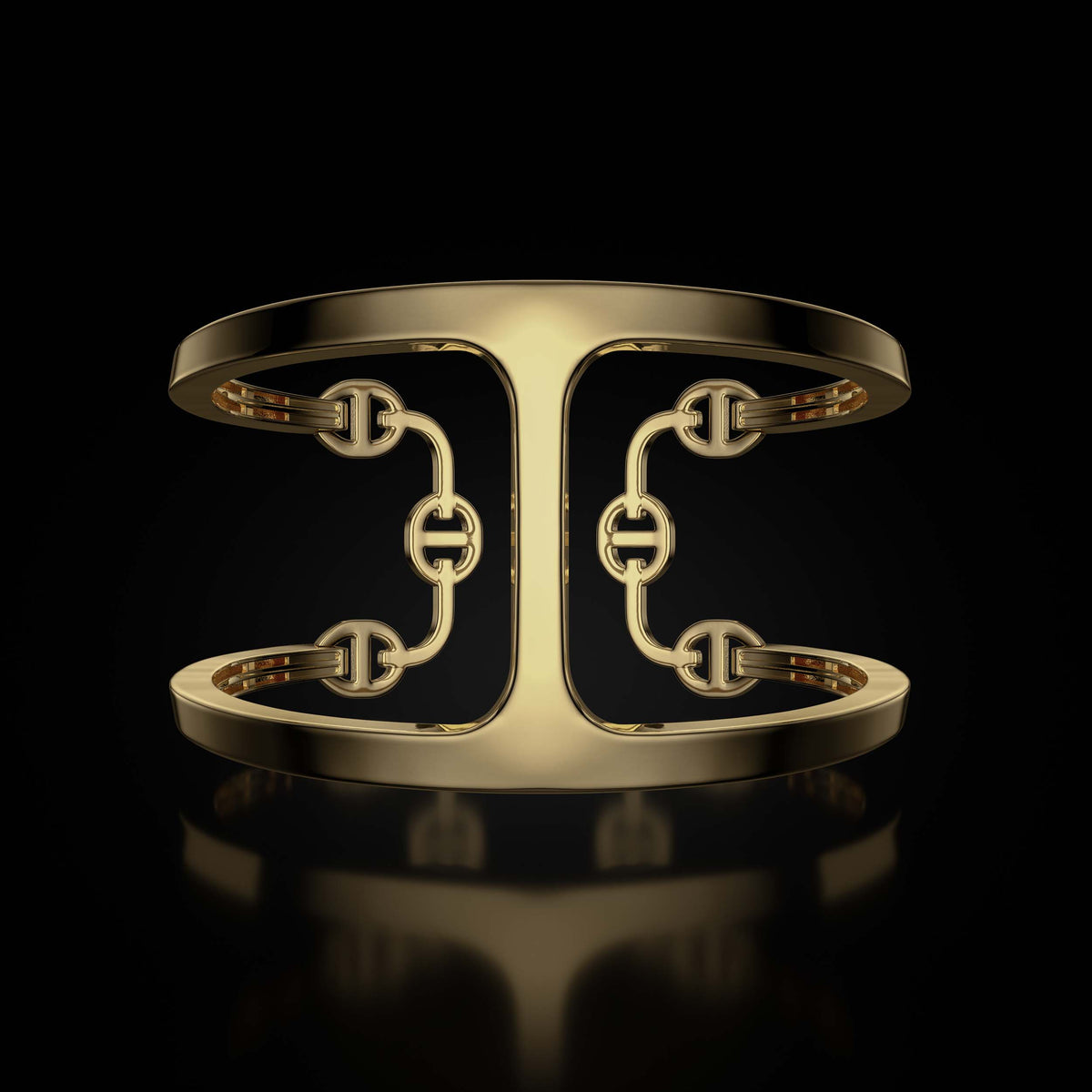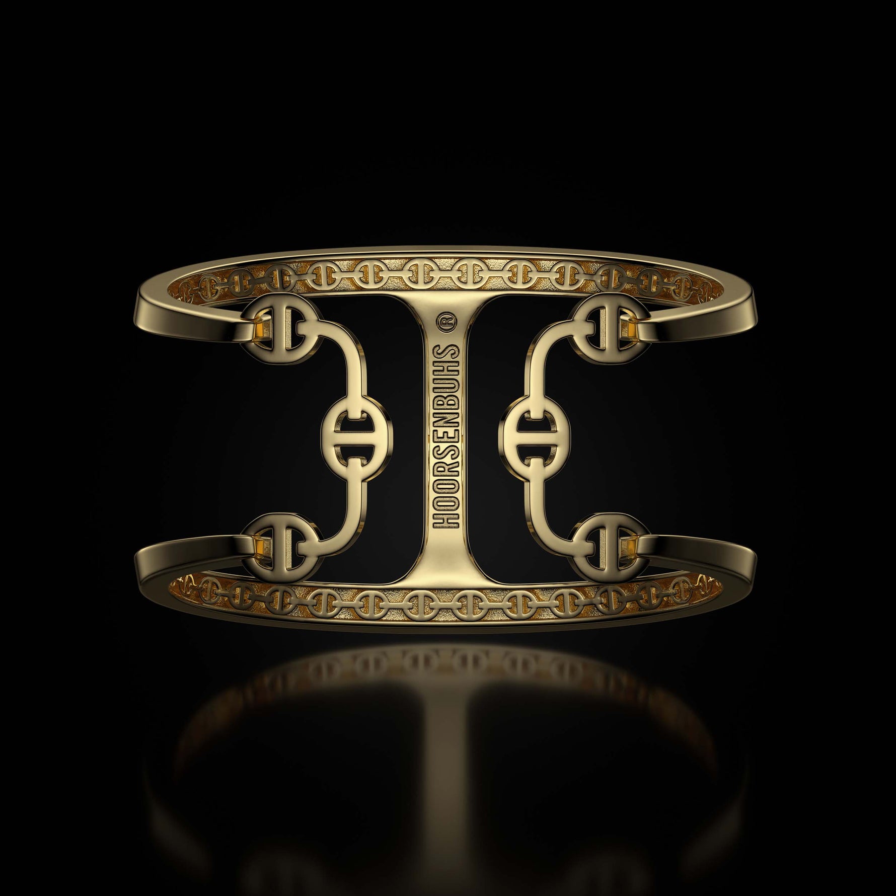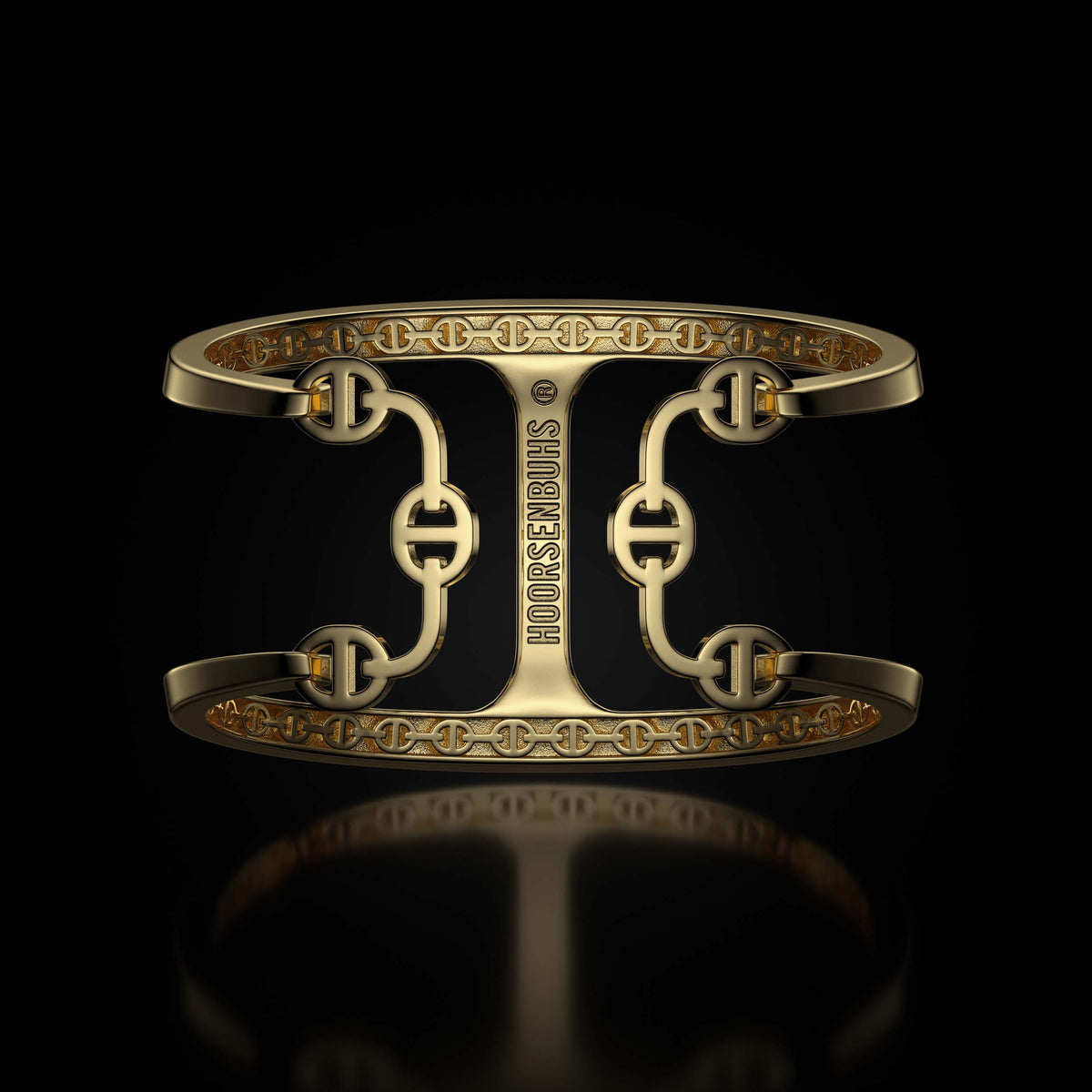 The Phantom Cuff is constructed from solid 18K gold and defined by HOORSENBUHS®’ Phantom link architecture. A single elongated link is wrapped and extended around the wrist, forming a continuous open structure with controlled proportion and presence.