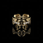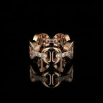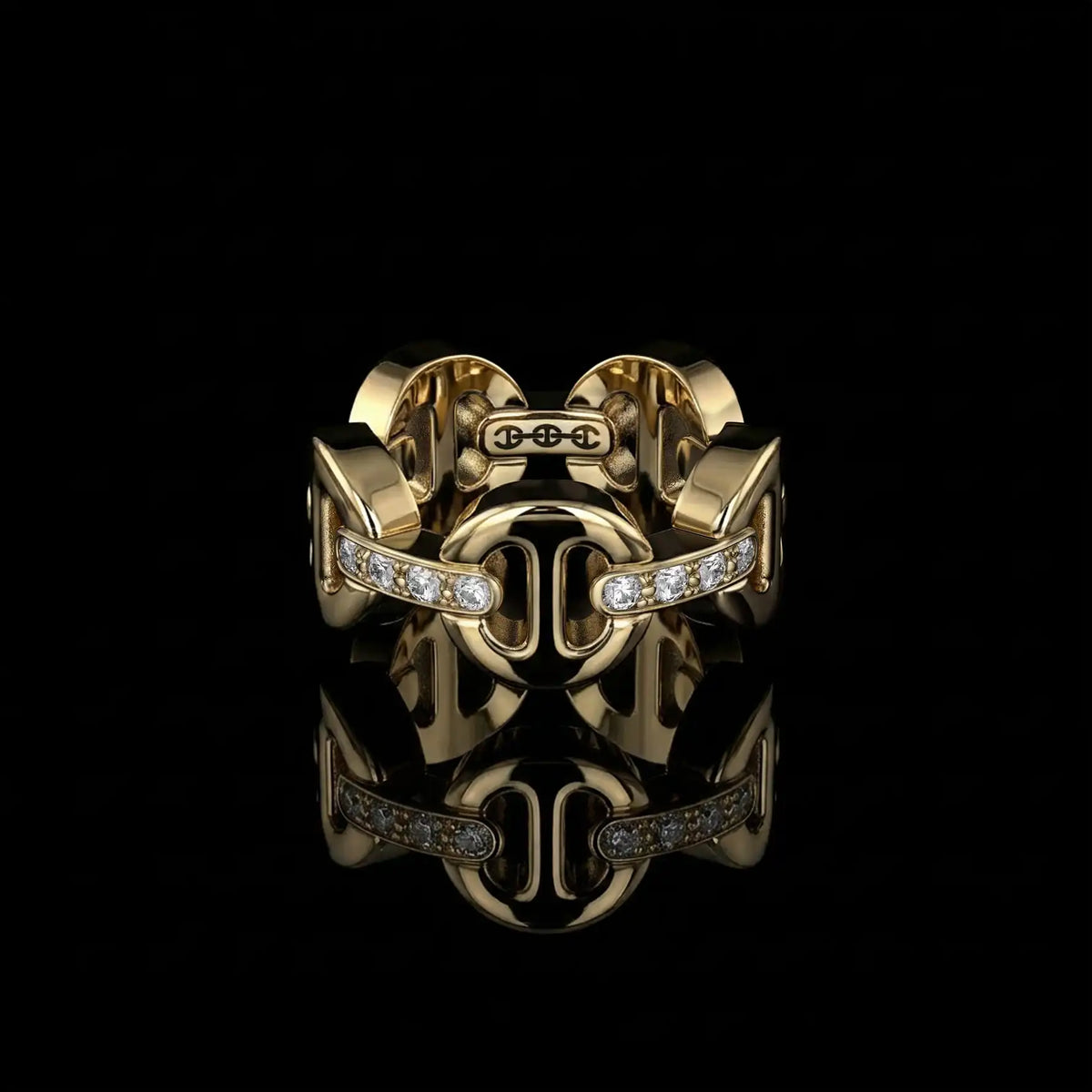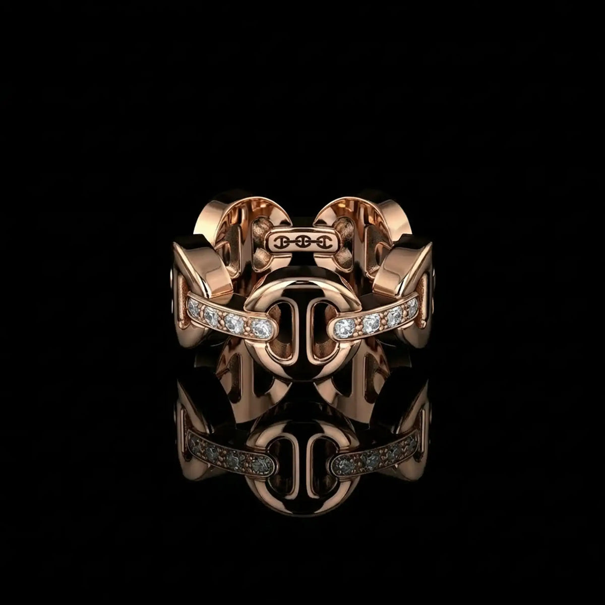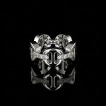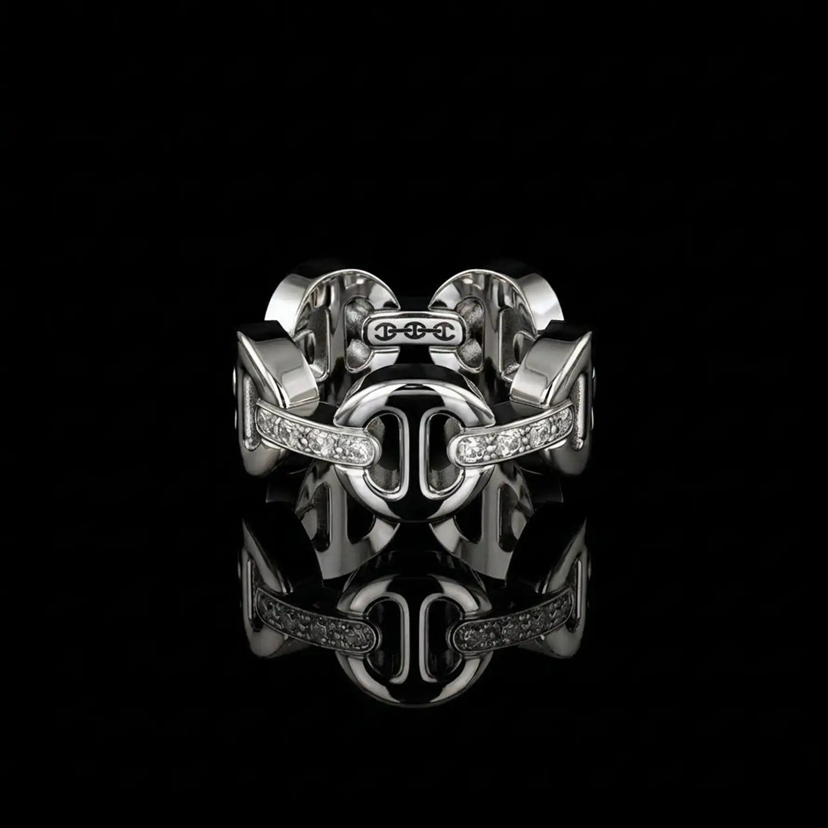 The Classic Tri-Link with Diamond Bridges is constructed from Sterling Silver and defined by HOORSENBUHS®’ original tri-link architecture. Broader proportions give the ring increased presence, while diamond-accented bridges are integrated with restraint, reinforcing structure rather than ornament.