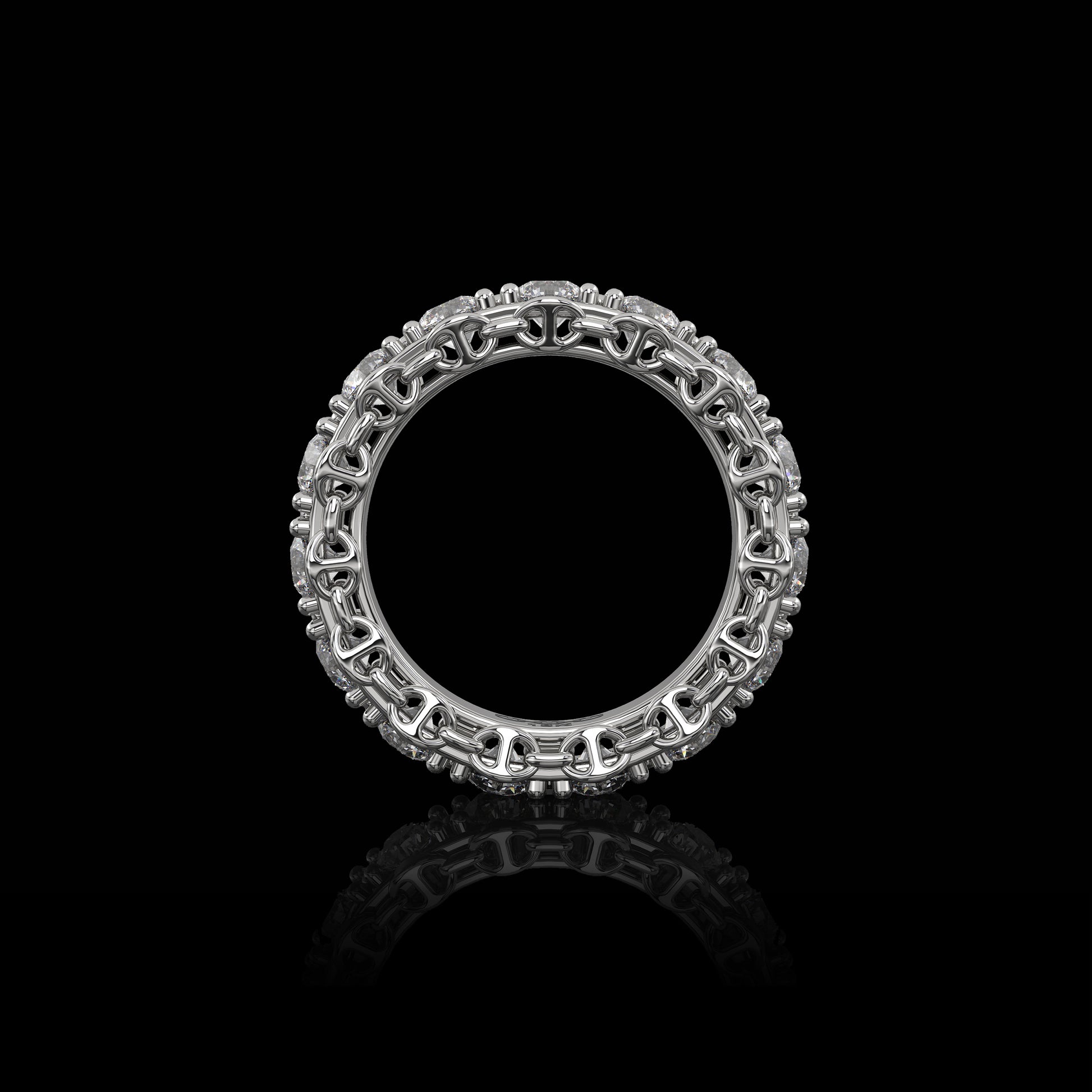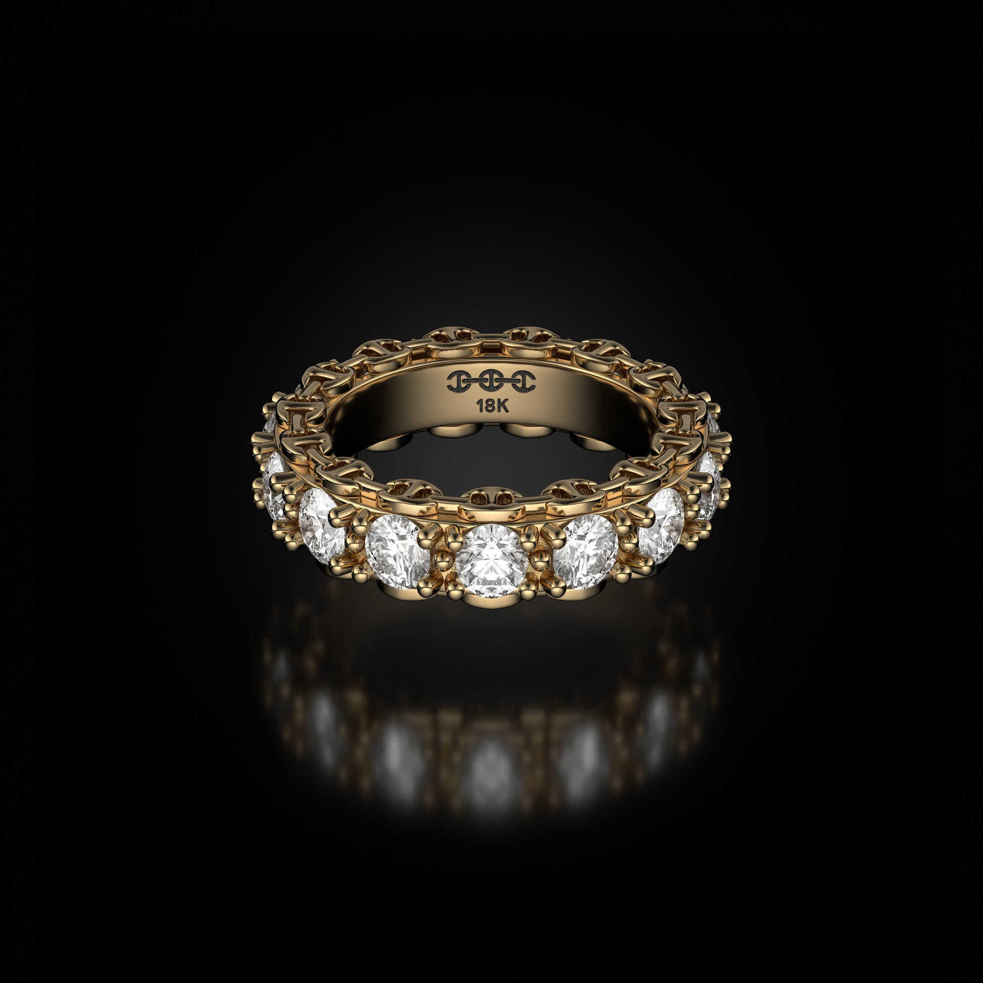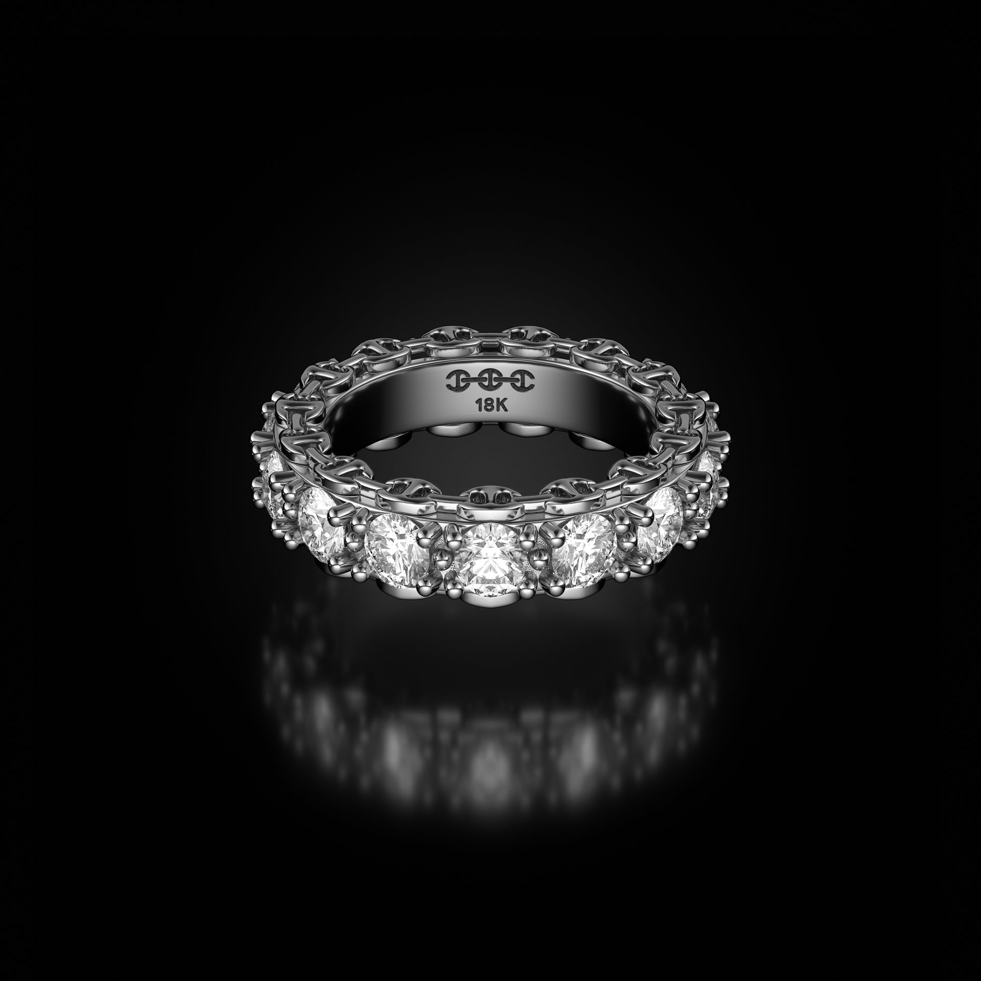 Tri-Link motif with prong set diamonds, round brilliant Belgian cut G-VSI.