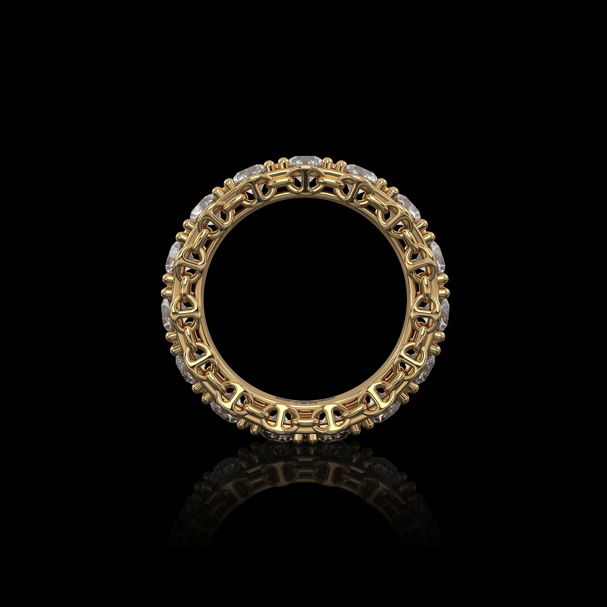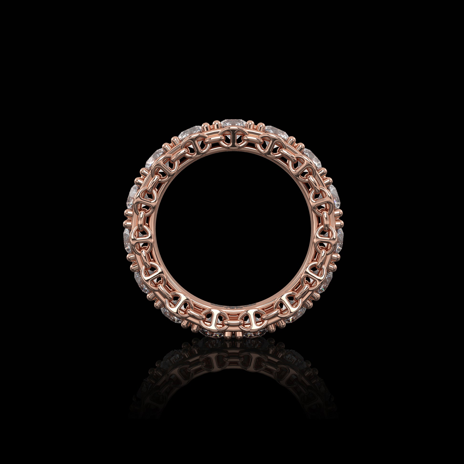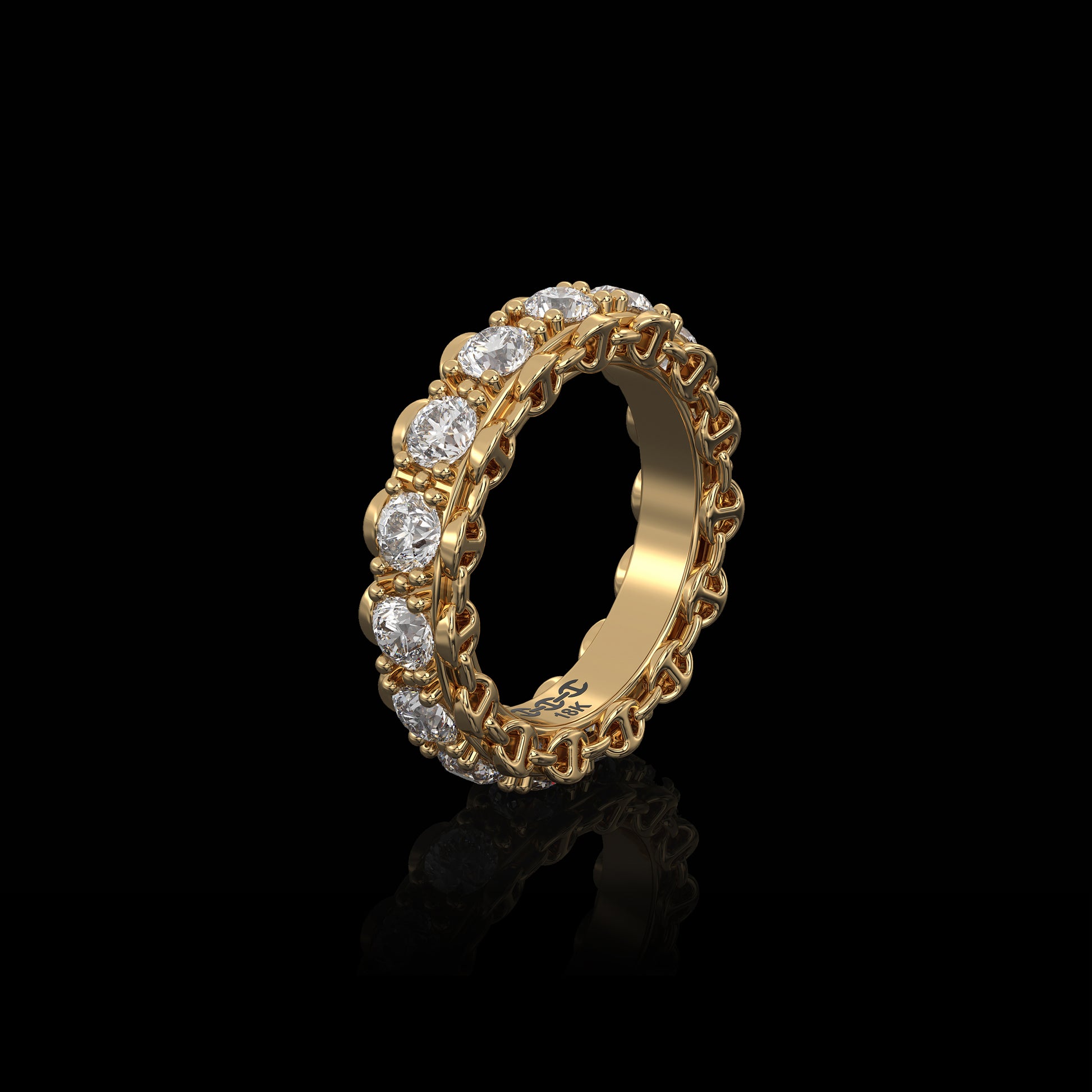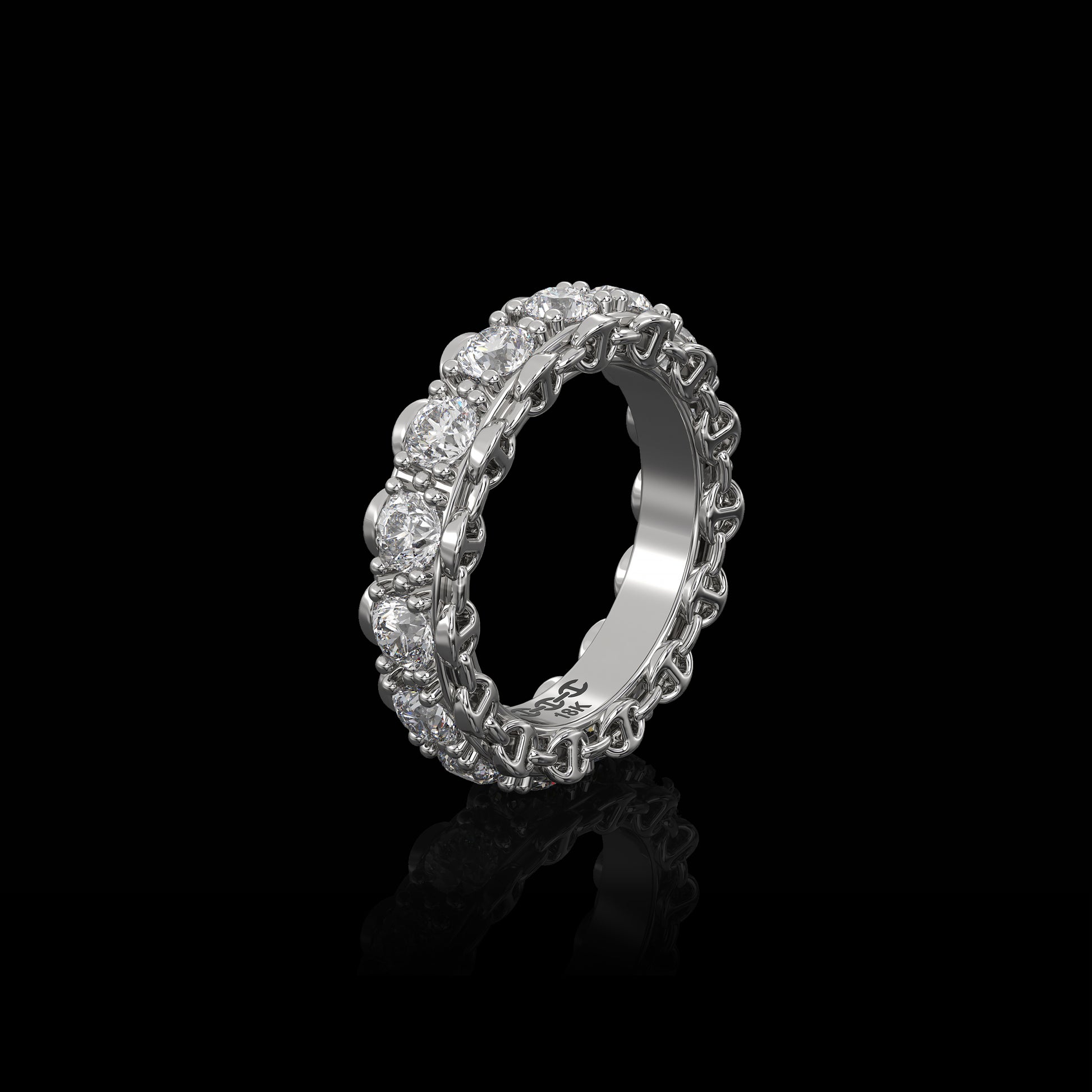 Tri-Link motif with prong set diamonds, round brilliant Belgian cut G-VSI.