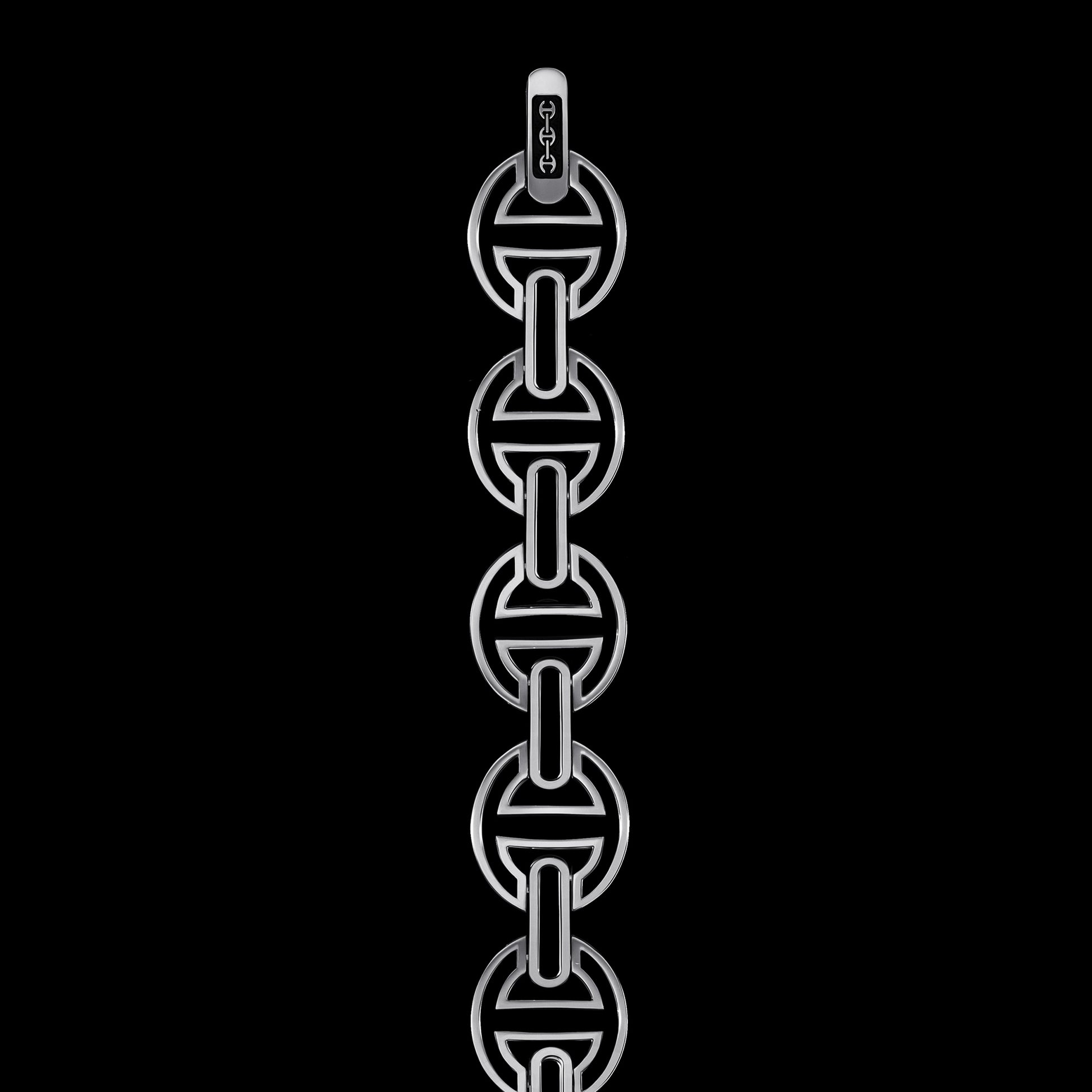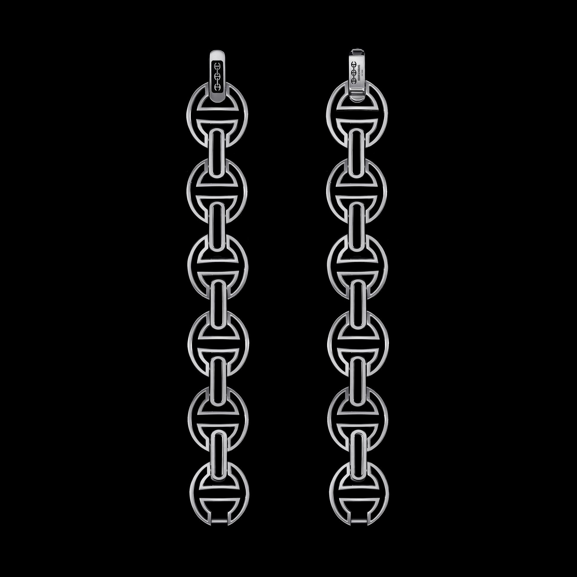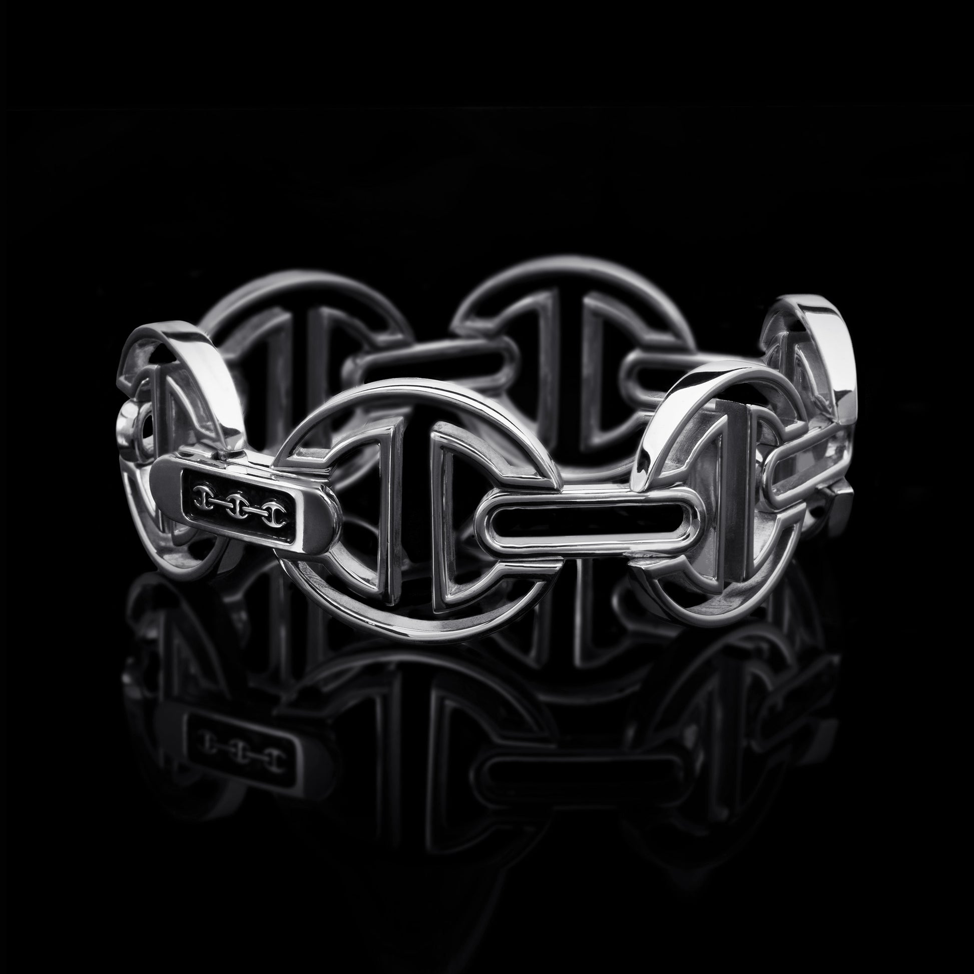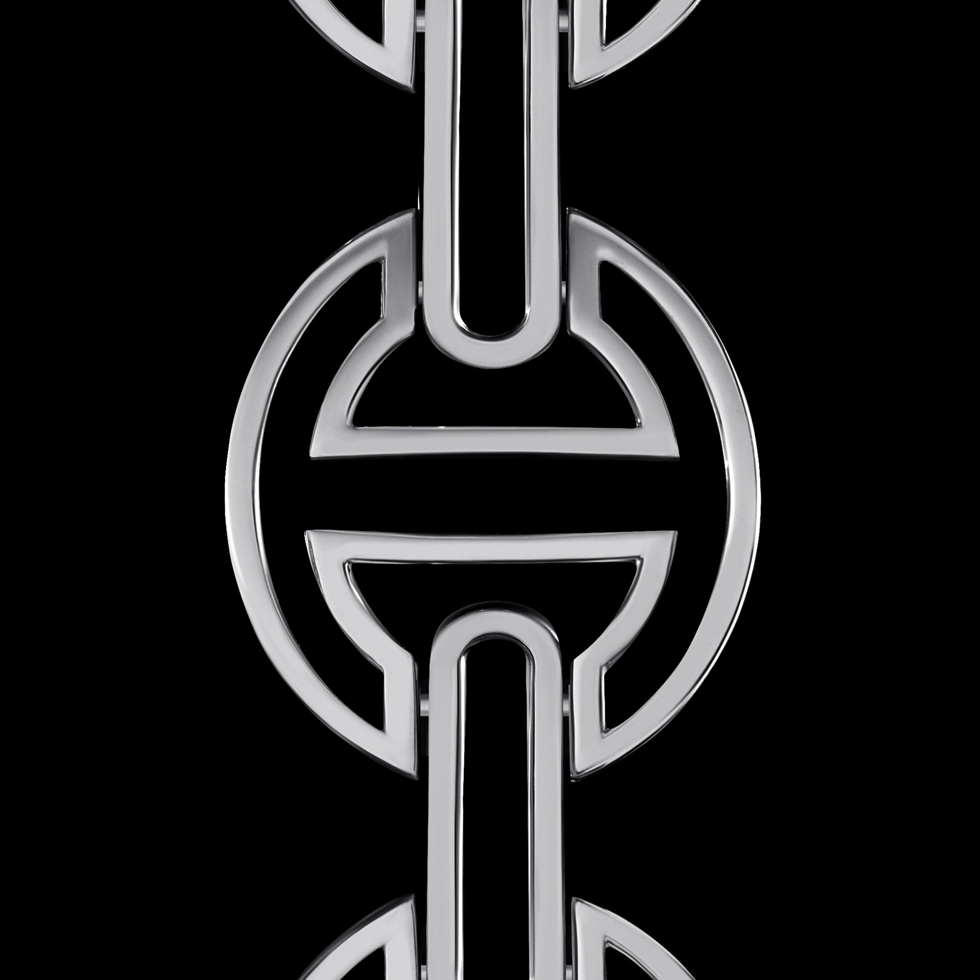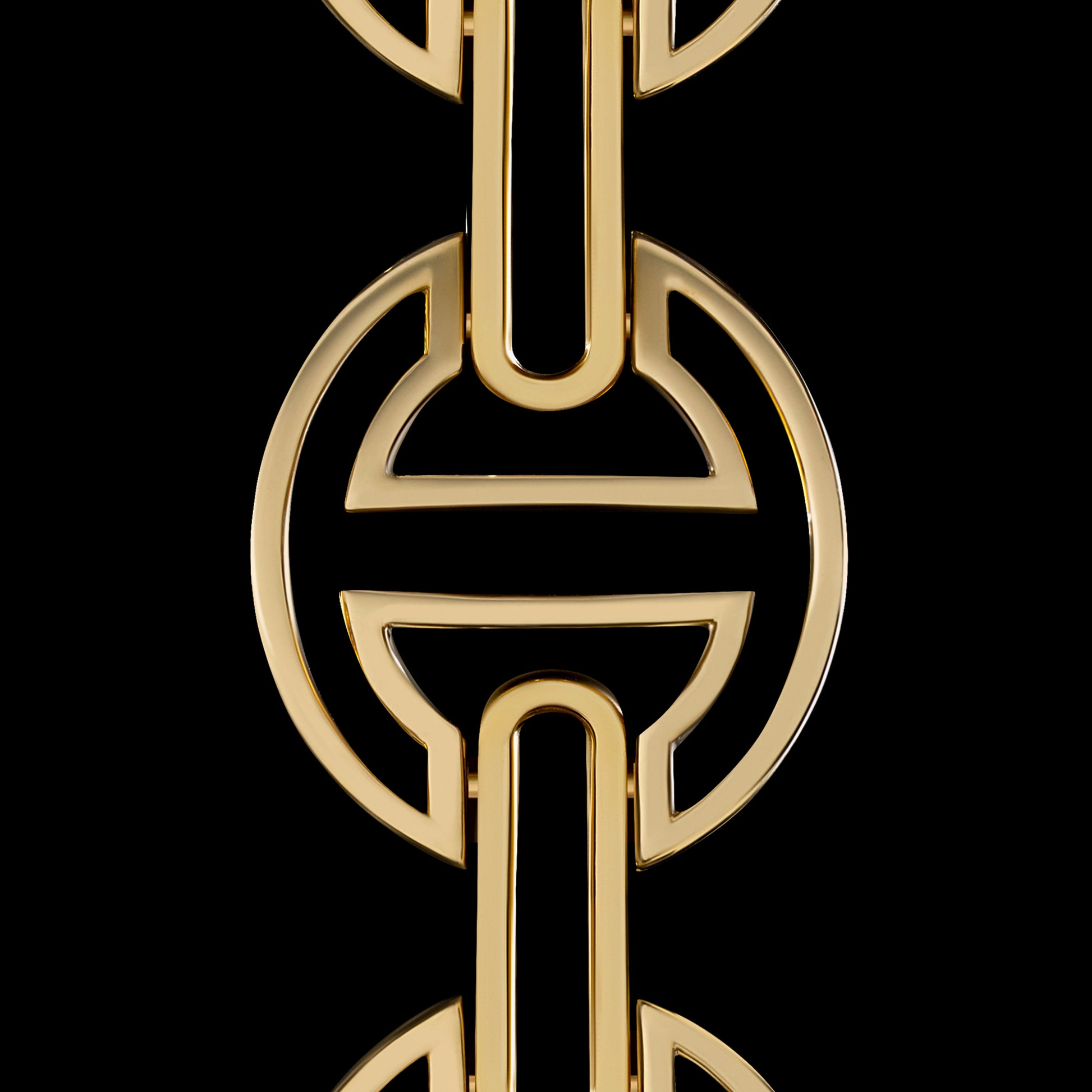 The MMV [large] hinged bracelet, hand crafted with our iconic tri-link motif in 18k gold, features silhouetted iterations of the tri-link with open bridges. The largest and most substantial version in our MMV series with a sophisticated deco face design is a perfect sleek and classic stand alone statement piece.