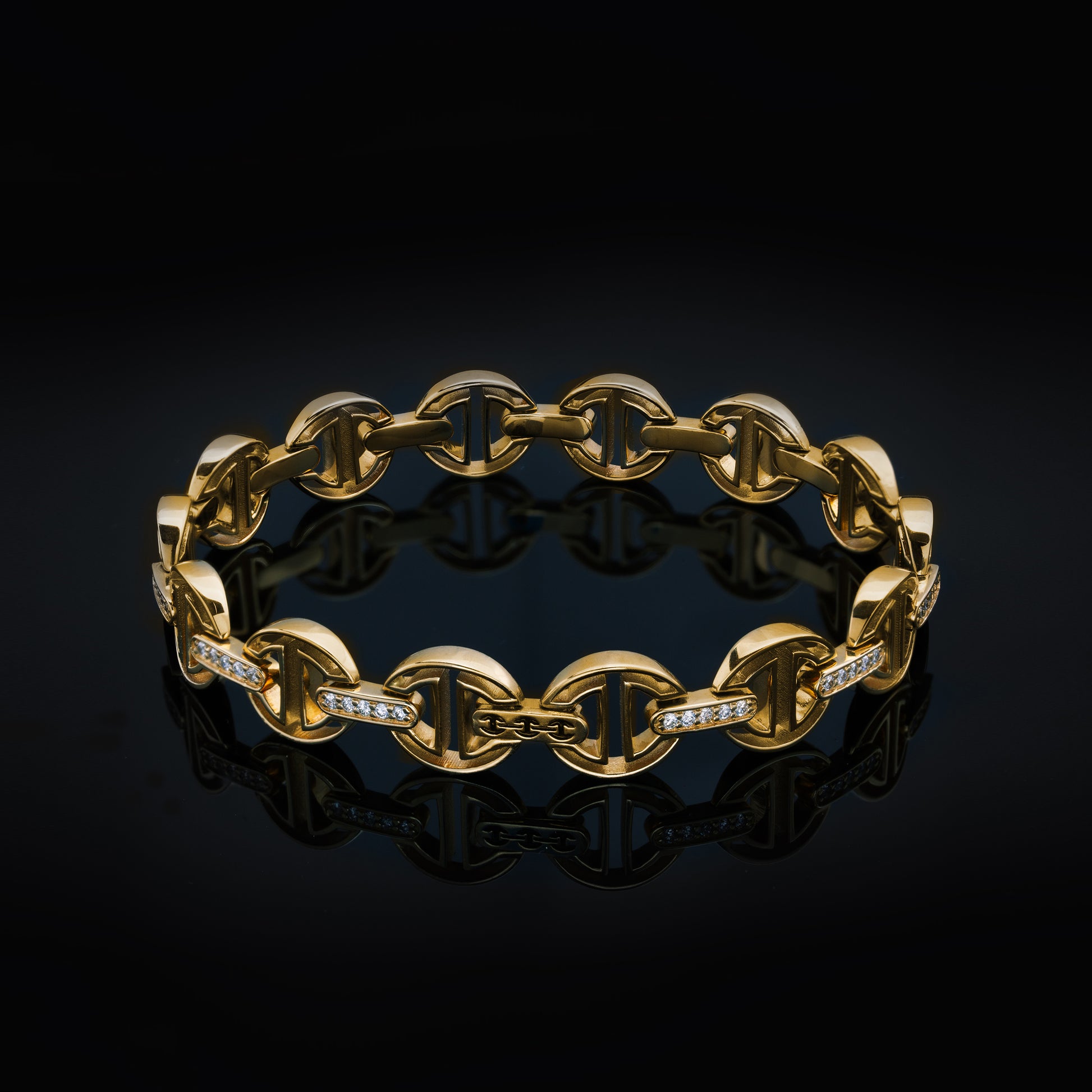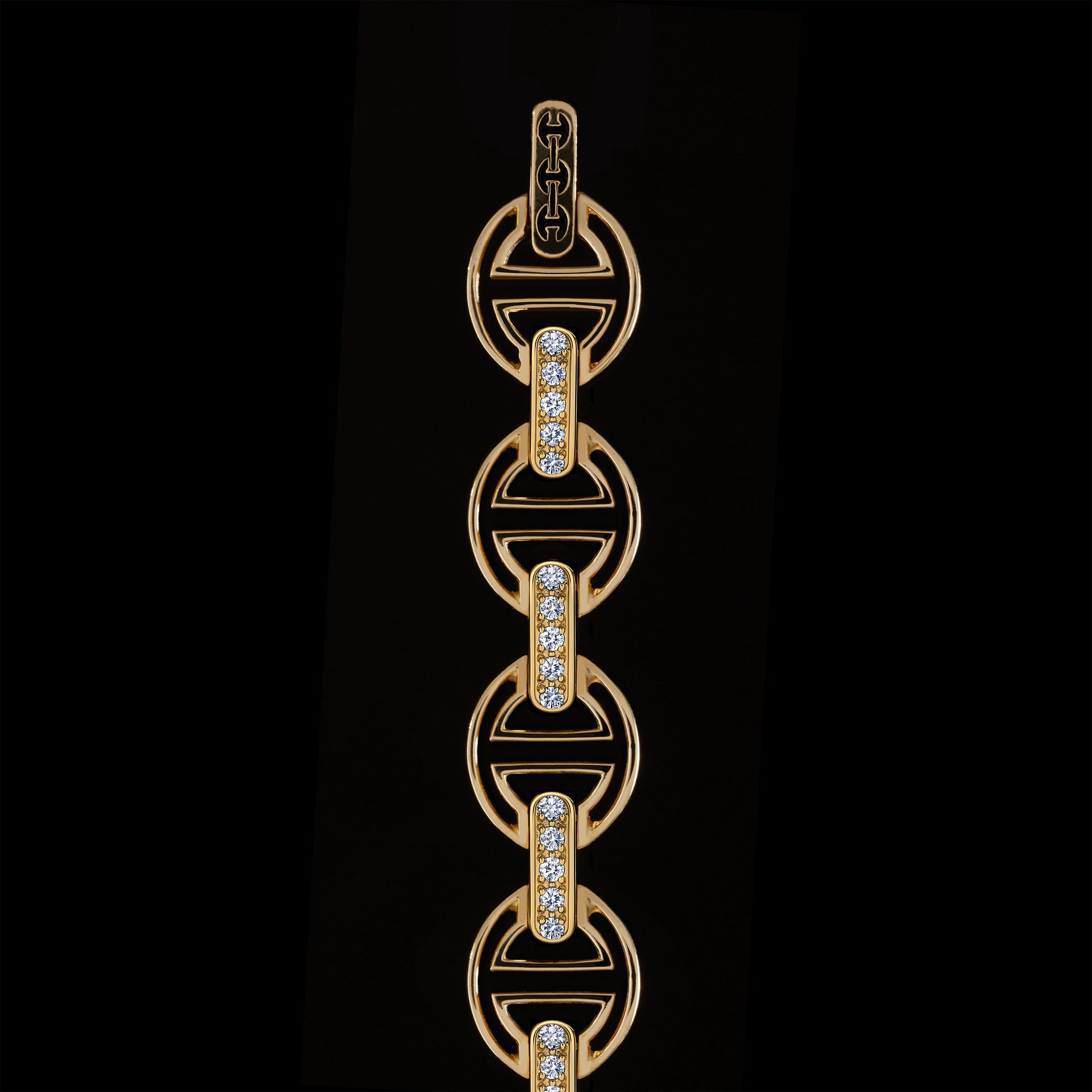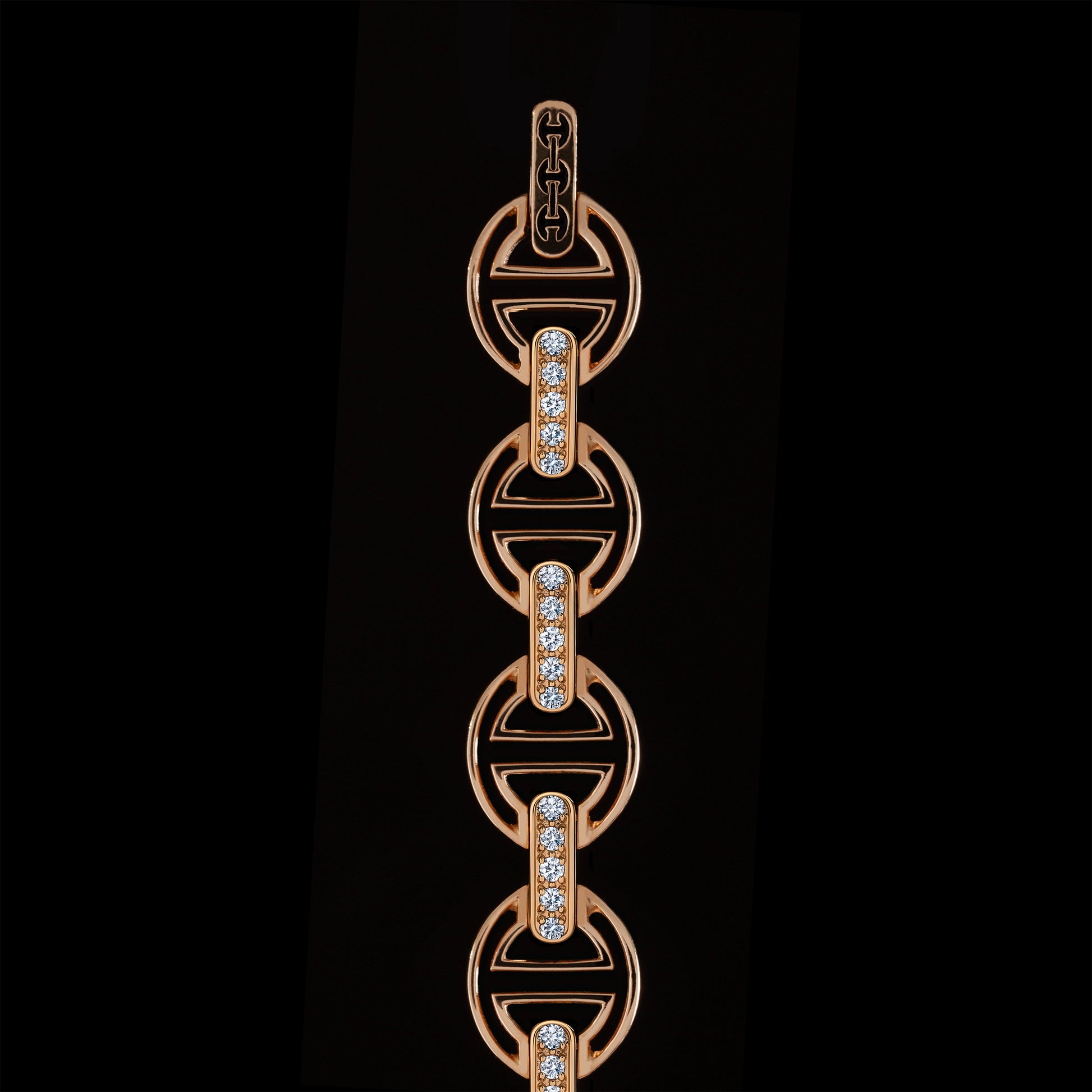 The MMV [small] hinged bracelet, hand crafted with the iconic tri-link motif in 18k gold features light, open iterations of the tri-link with diamond bridges. Our most delicate elevated variation of the MMV series with an ultra slim profile and sophisticated deco face design is a perfect addition to your bracelet stack.