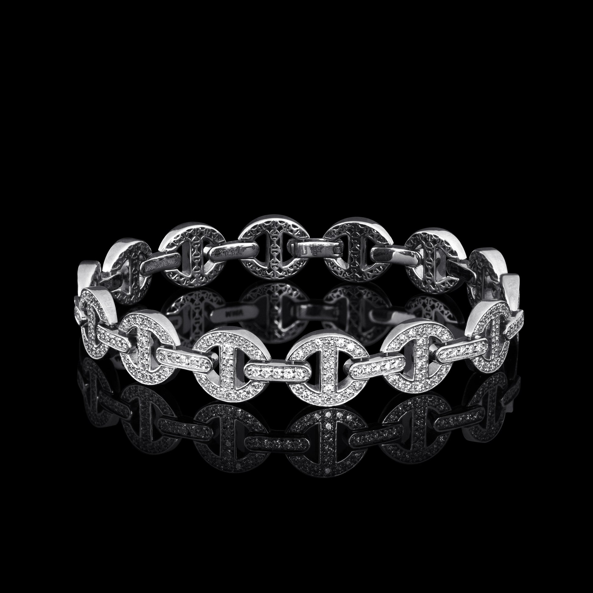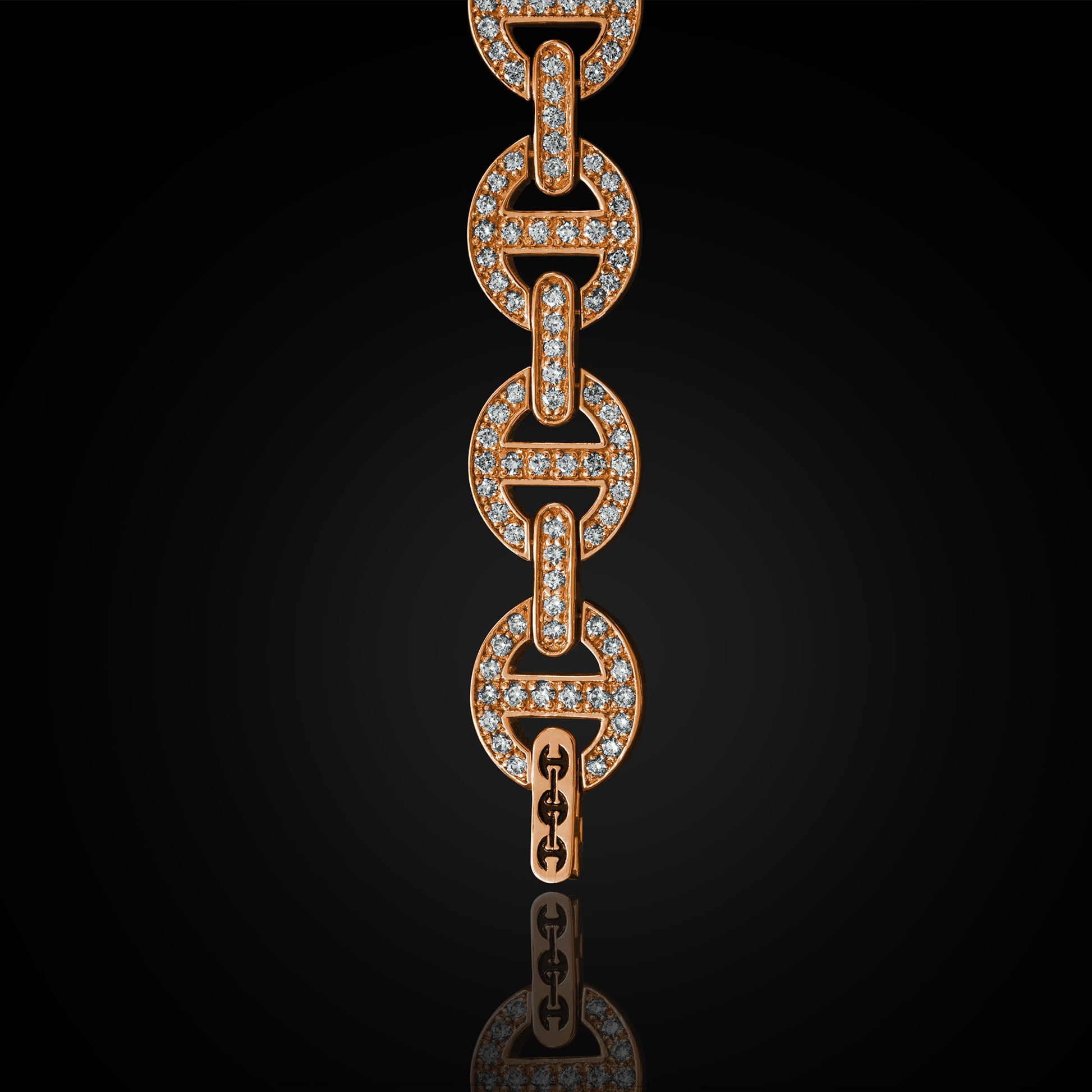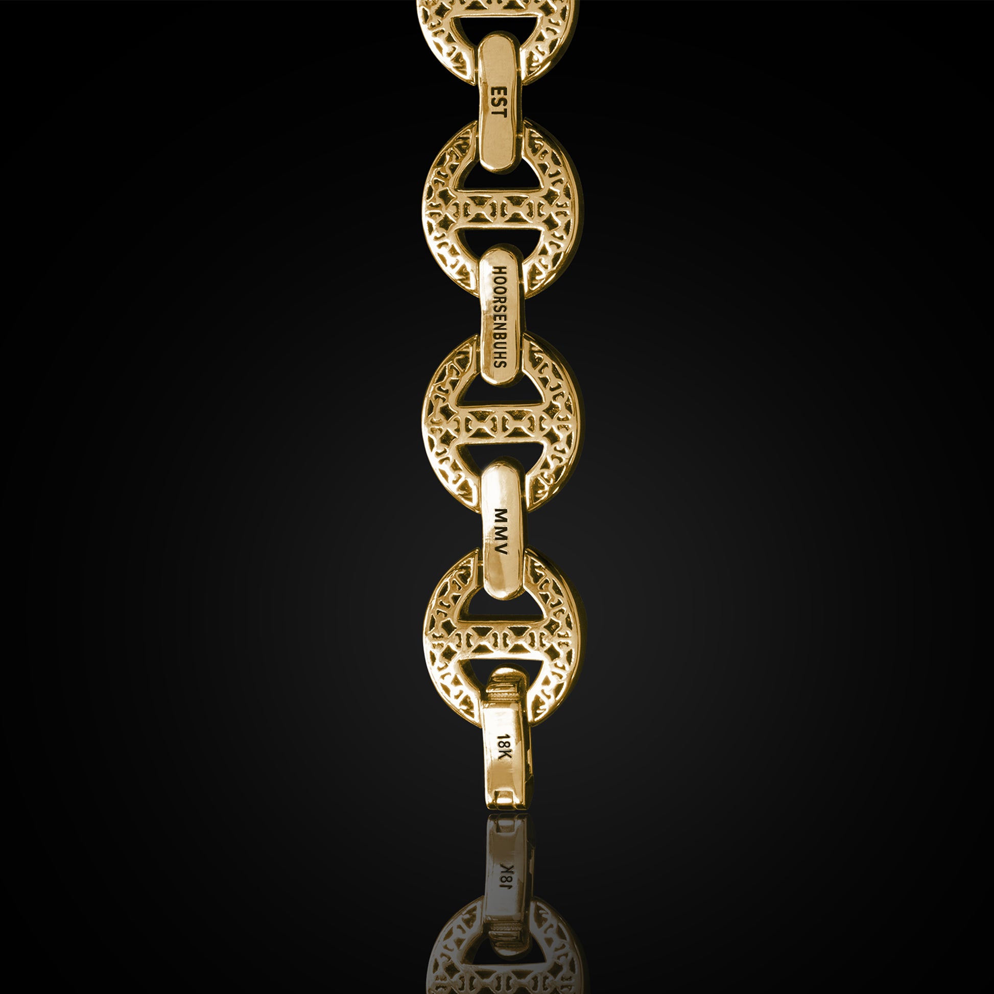 The Antiquated MMV [small] hinged bracelet, hand crafted with the iconic tri-link motif in 18k gold featuring silhouetted iterations of the tri-link handset in entirety with G VS1 natural diamonds. Our most delicate elevated variation of the MMV series with an ultra slim profile and sophisticated deco face design is a perfect addition to your bracelet stack.