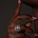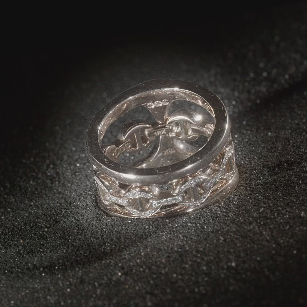 A single iconic link wrapped and elongated around the finger combined with our classic tri-link clique that snaps into place, creating a stunning customizable piece antiquated with diamonds.