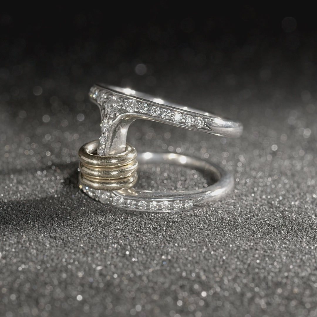 The Pantom SK Pavé ring is comprised of a Hoorsenbuhs Phantom ring in .925 sterling silver with pavé white diamonds and adorned with Spinelli Kilcollin signature 18k yellow gold annulets.