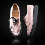 Pink Suede Creeper in collaboration with esteemed British Shoemaker George Cox. Featuring a pink suede upper with iconic crepe sole, custom .925 sterling silver d-rings, and a branded stamp at the heel. A modern take on a cultural classic.