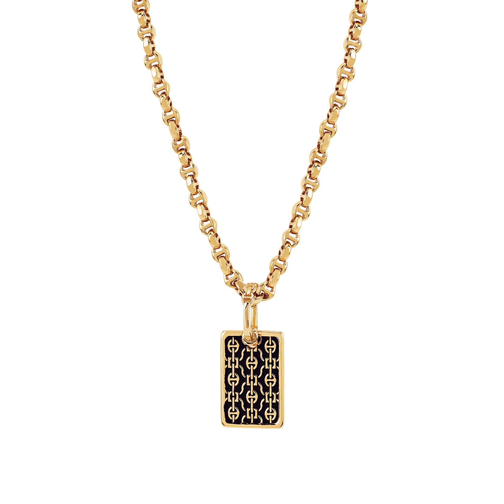 Rectangular pendant with an all-over relief Tri-link pattern. *Chain not included