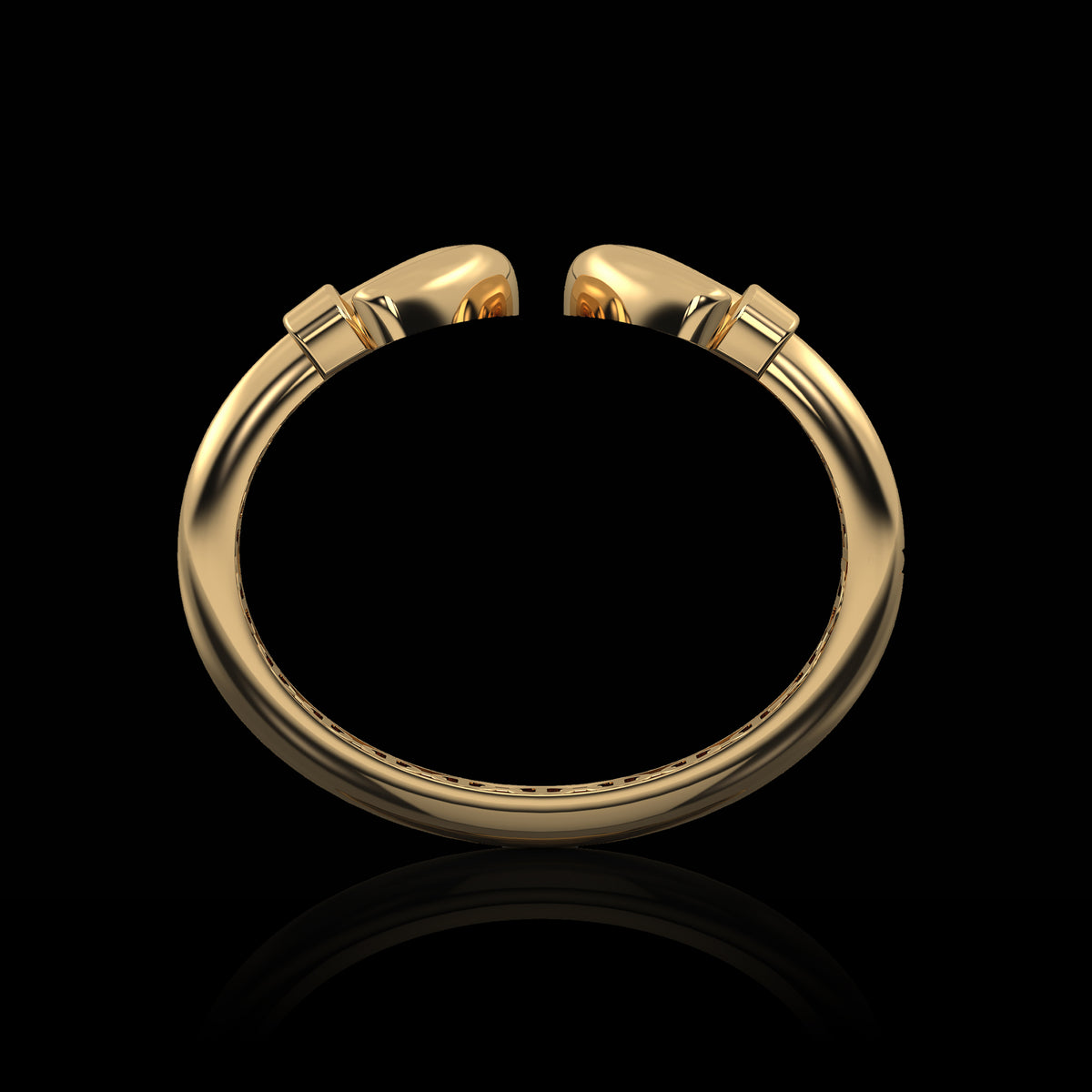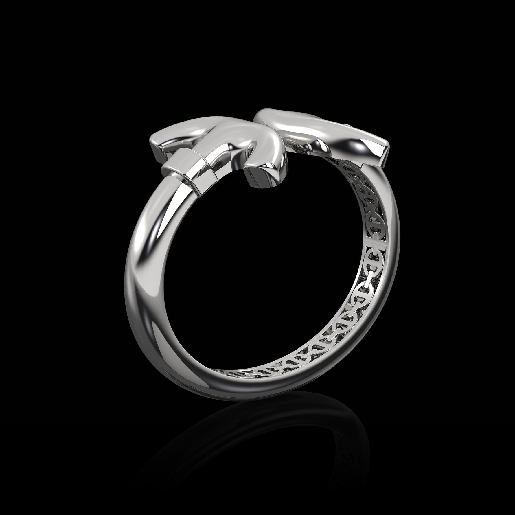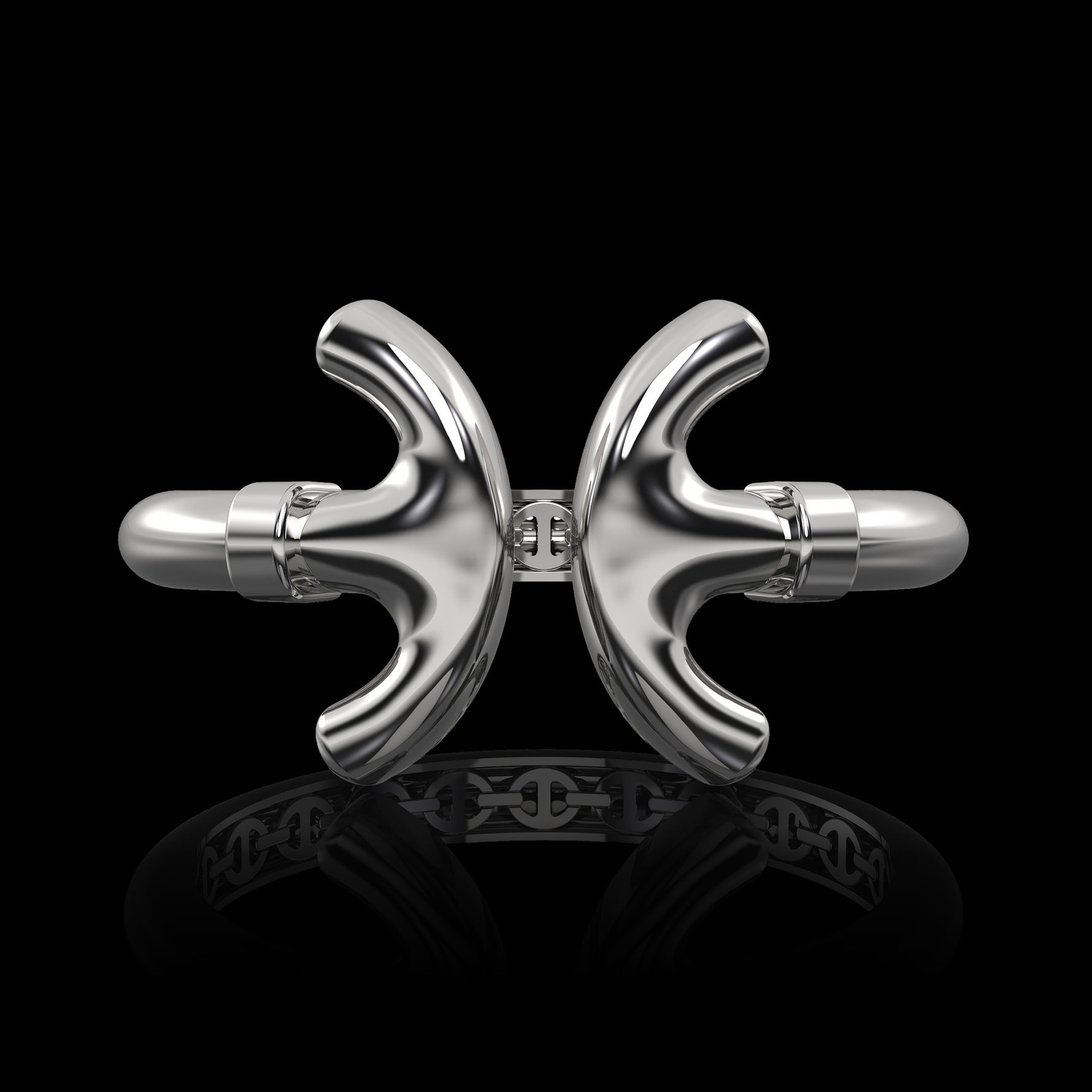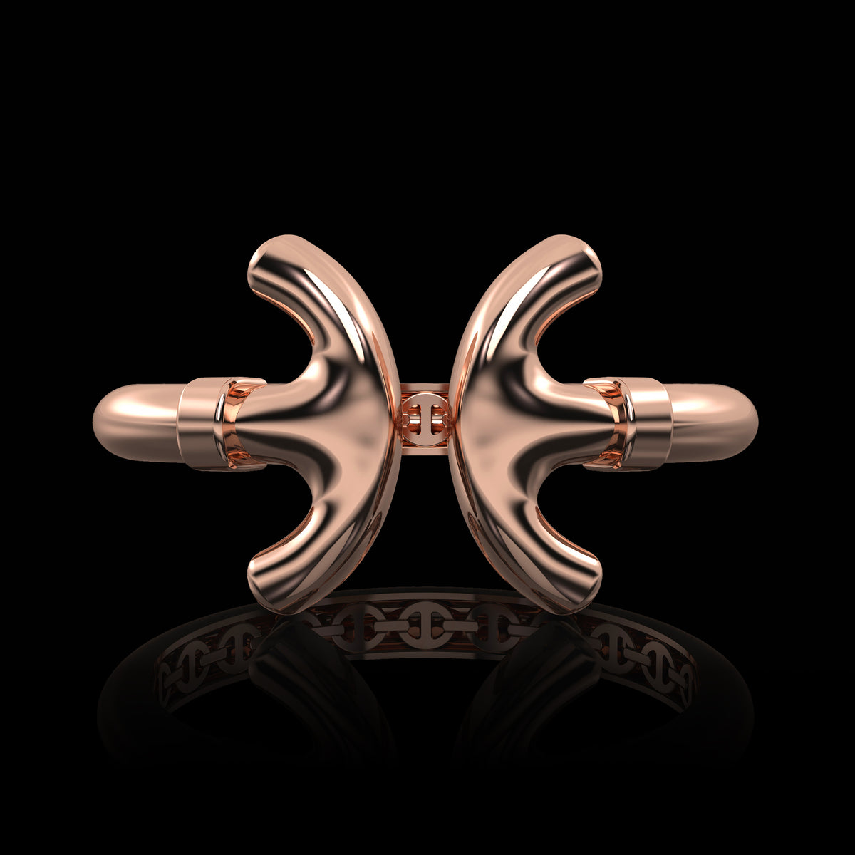 A cuff bracelet featuring a single iconic link elongated at the center and curved around the skin so the ends meet.