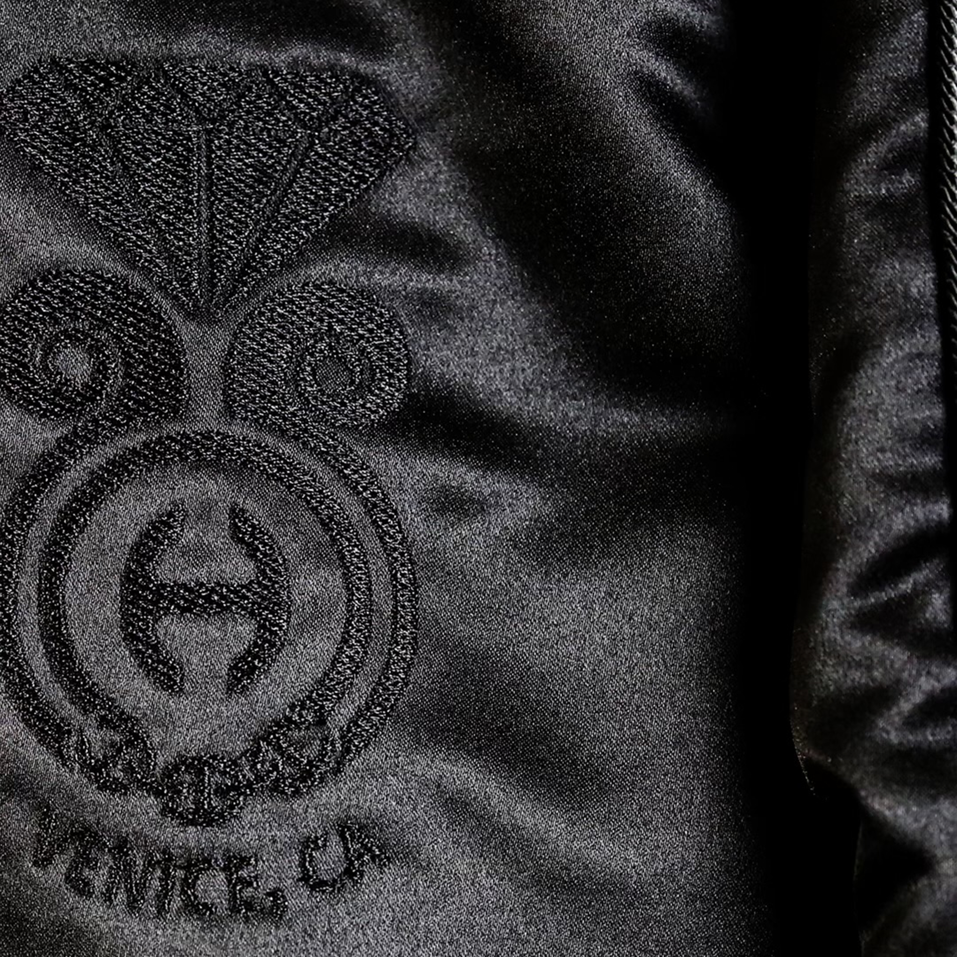 Featuring a satin outer shell with piping, acrylic trim, and padded nylon lining, our souvenir jacket is embellished with tonal embroidery on the left chest and back. Custom branded zero-snap hardware for closure. Made-to-order in our California Atelier. Please allow 2-3 weeks for shipping.