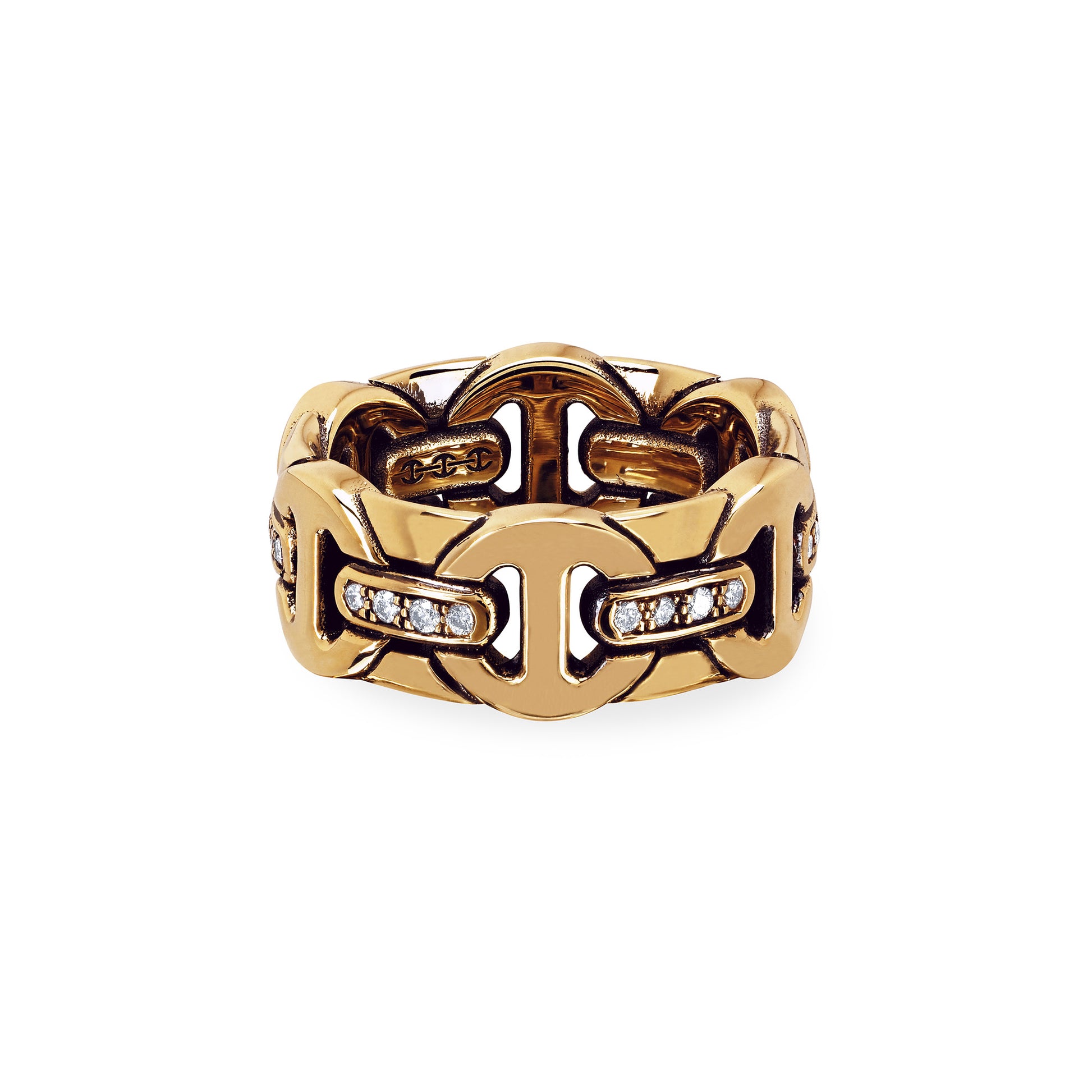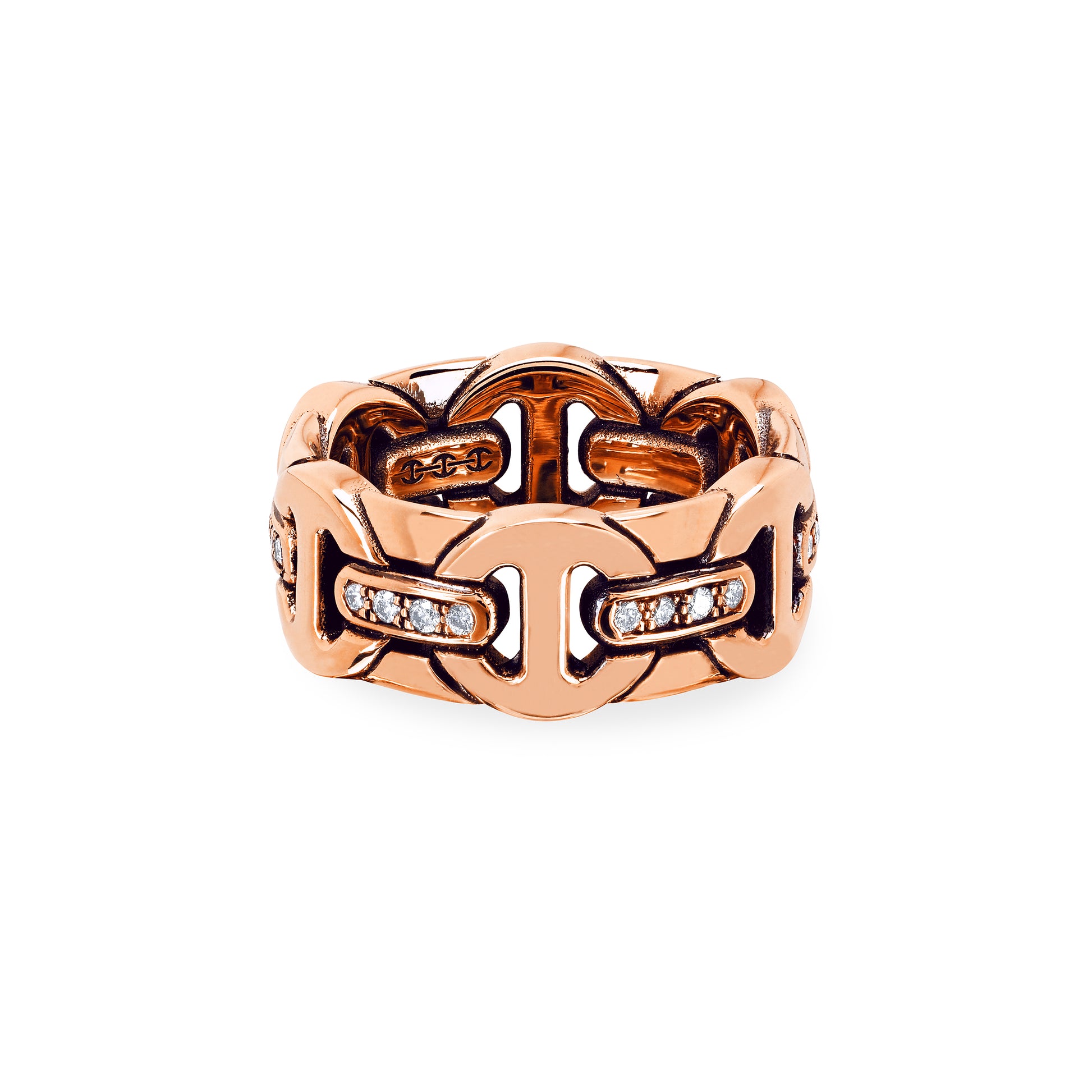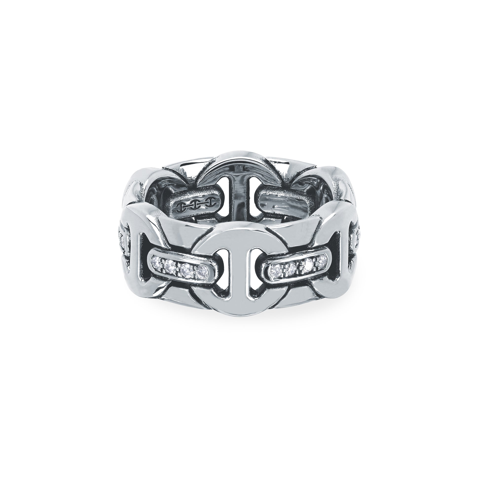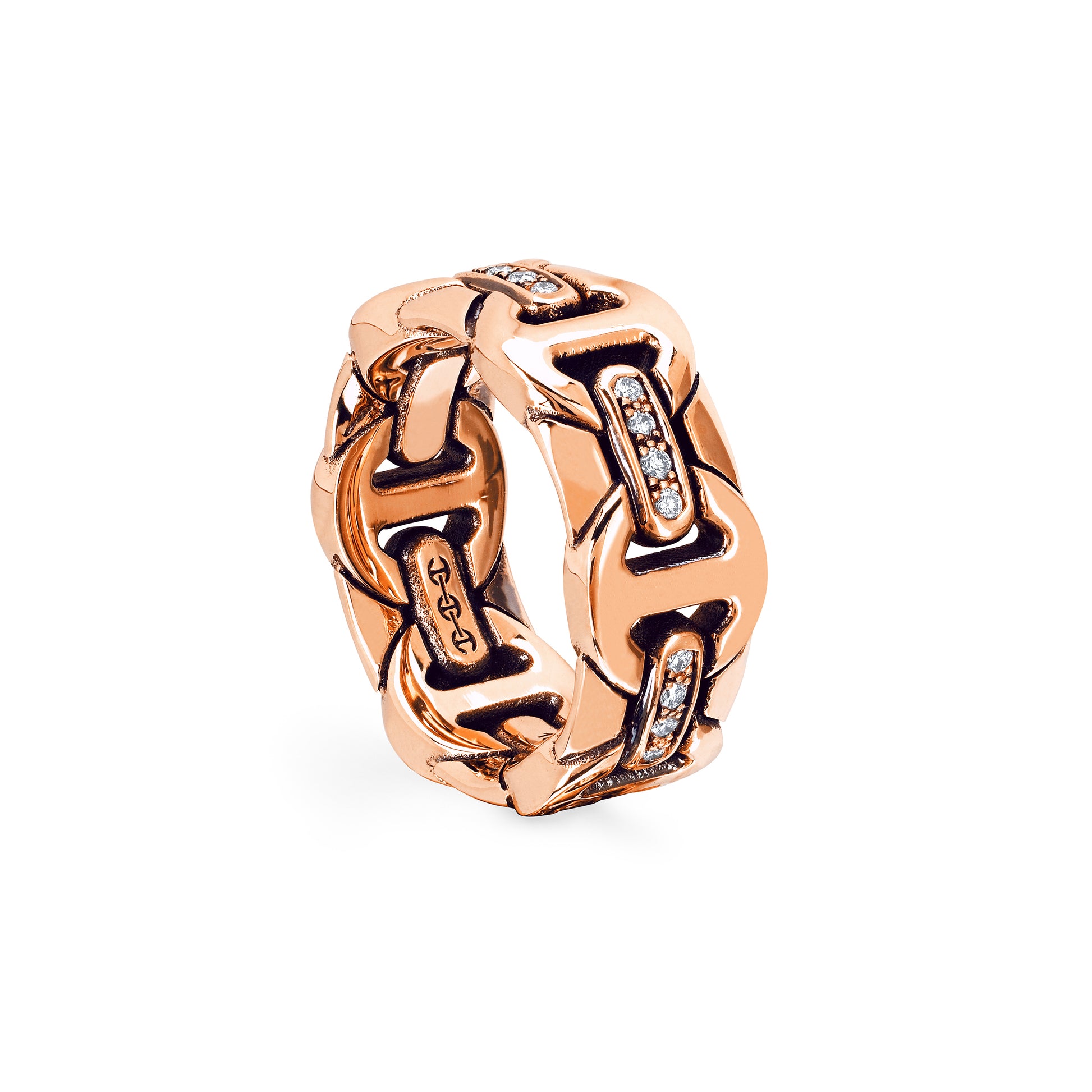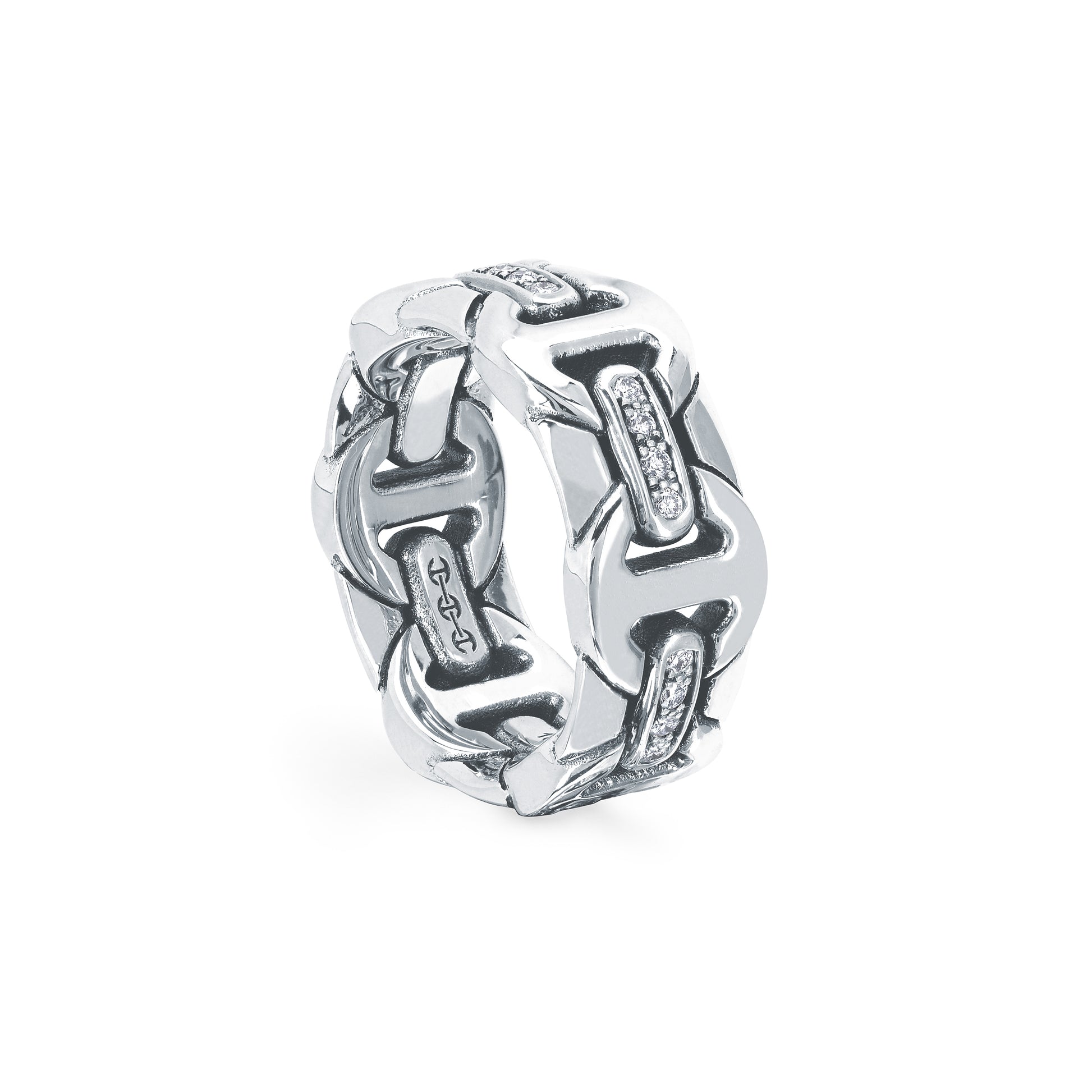 A modern take on our heritage link rings with diamond bridges. The wall creates a more traditional band encapsulating it's original elements.